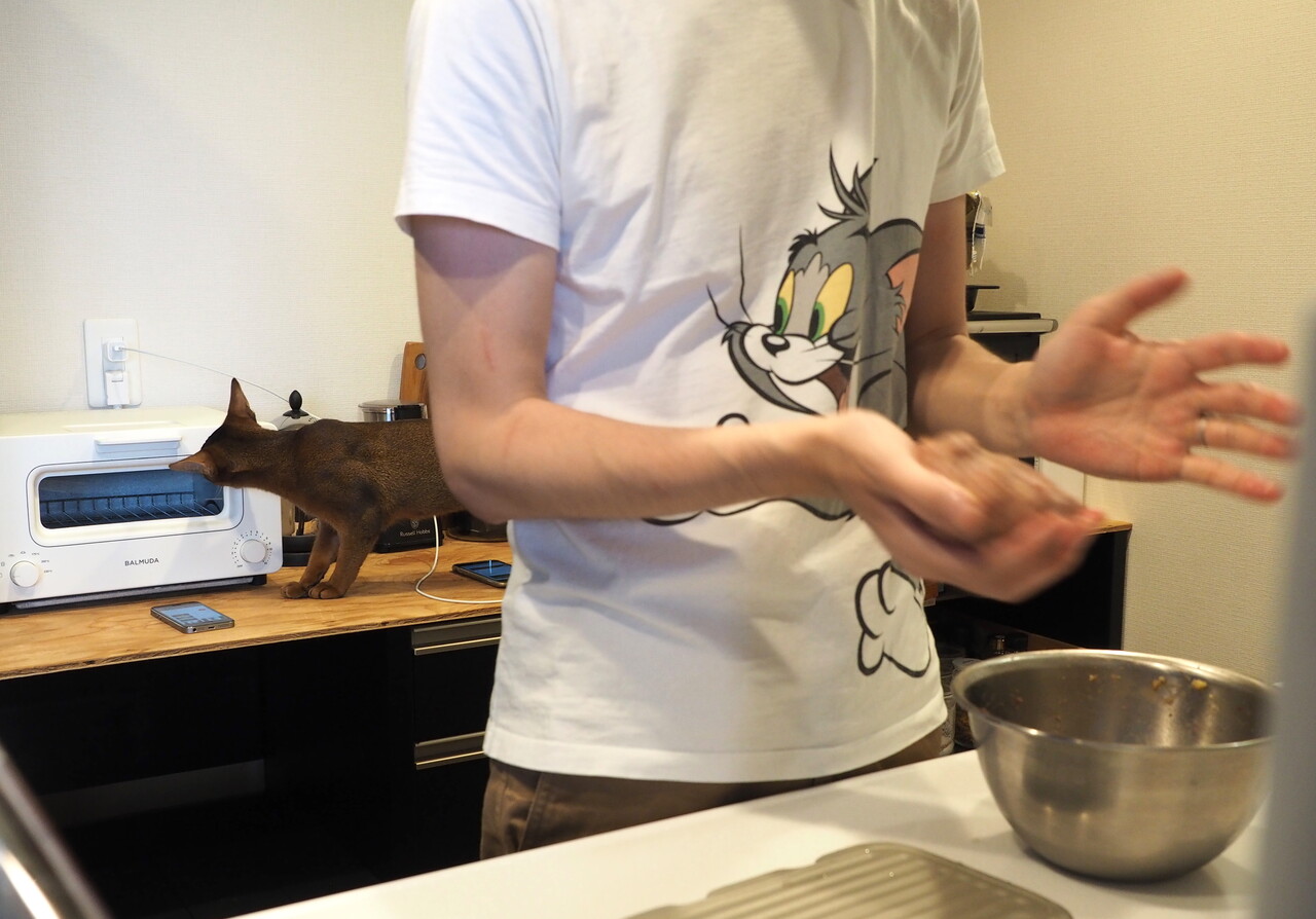 一緒に作ってくれる相棒のたまがいないからと、トムのTシャツでキッチンに立つだんなさま。
