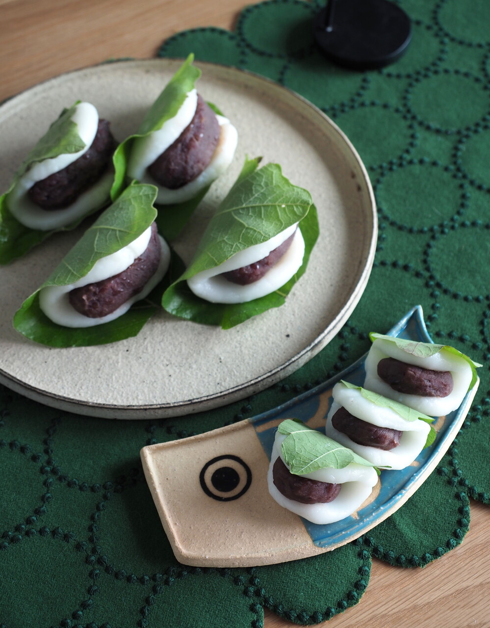 ミニミニ柏餅は、柏の葉っぱを小さく切って作りました。