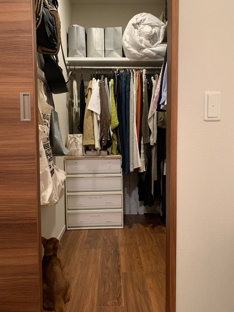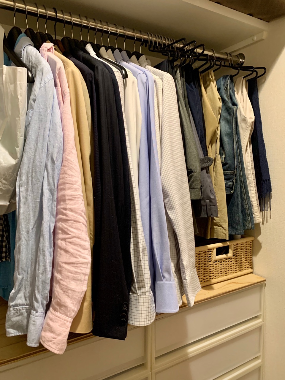 これまでは、季節外の服を手前と入れ替えてましたが、ハンガーだらけで圧迫感がありました。