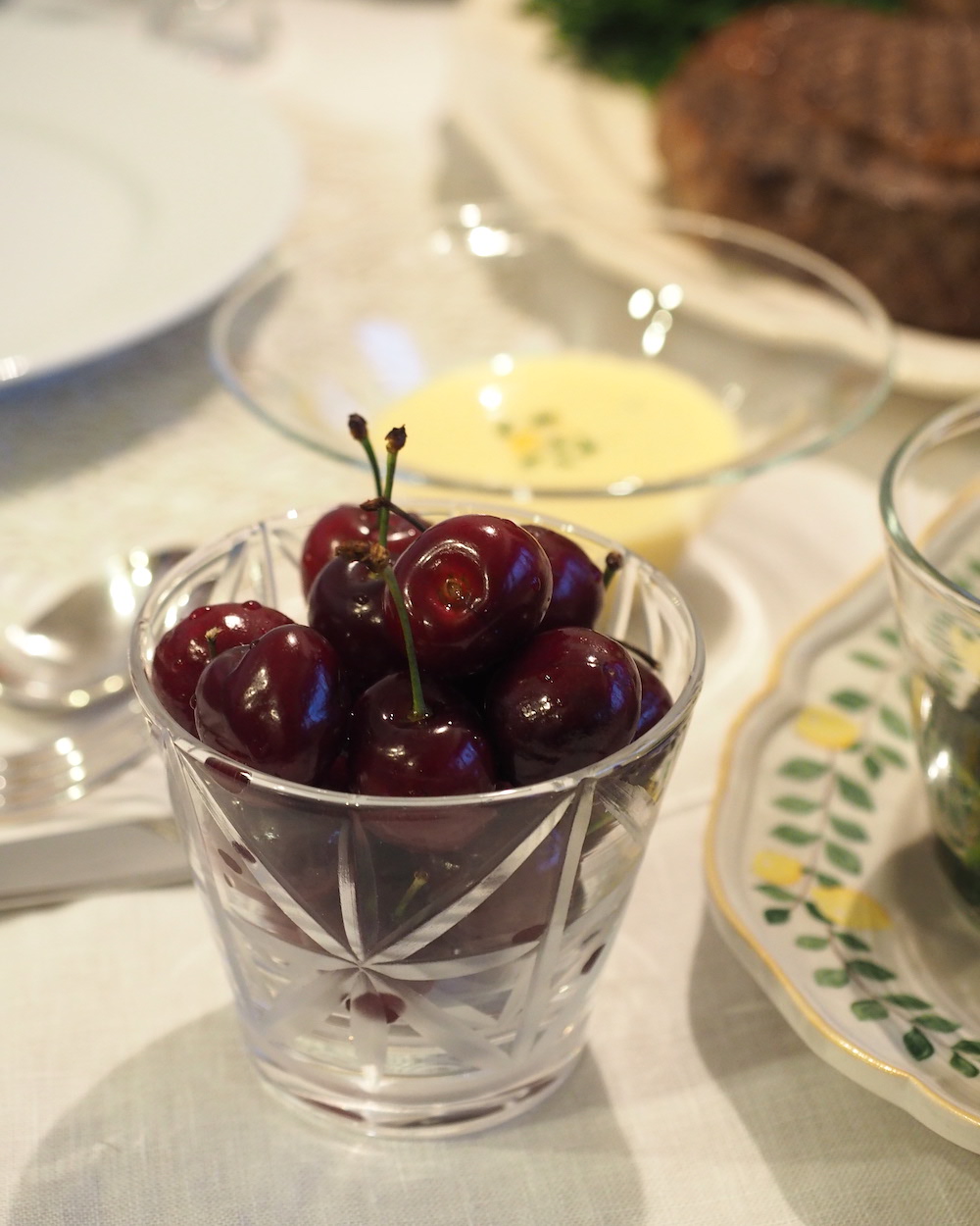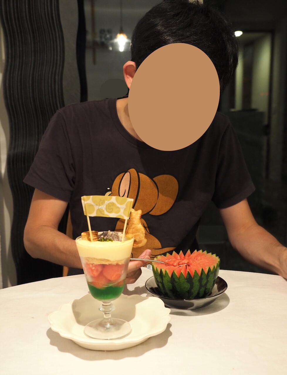 食後は、ろうそくに火をつけて、スイカのグラスデザートをいただきました♪
