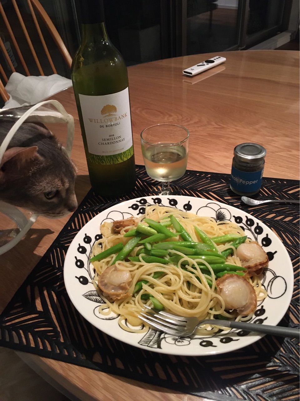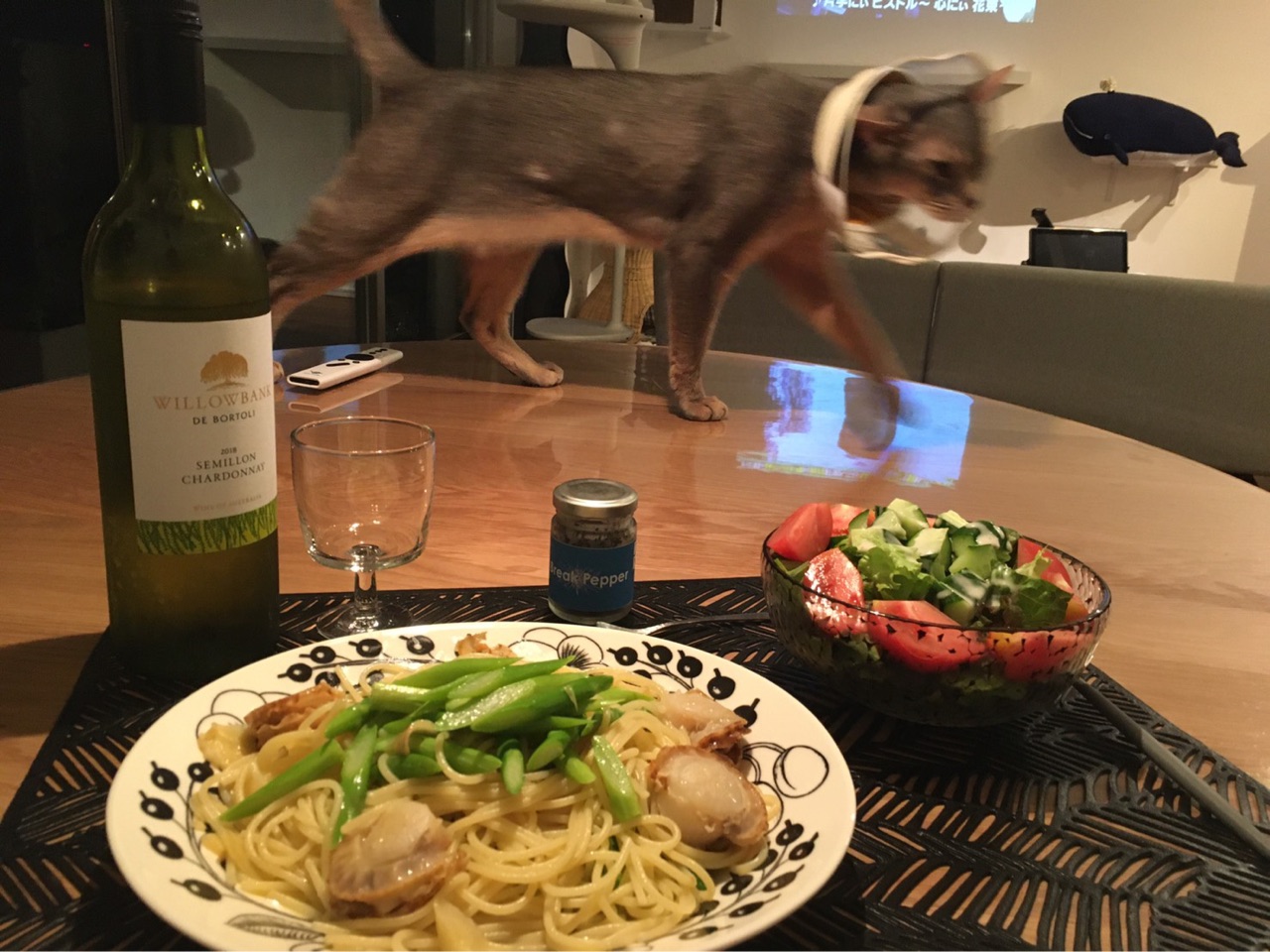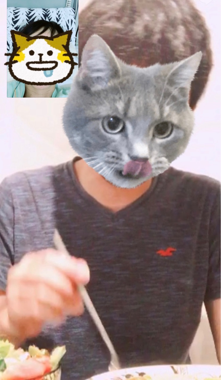 オンライン食事♪だんな様が作ったパスタ、美味しいそう♪食べられないけれど、一緒に食卓を囲んでる気分になりますね♪だんな様もじょりじょりさんに寂しい思いをさせないようにとしていて優しい♪