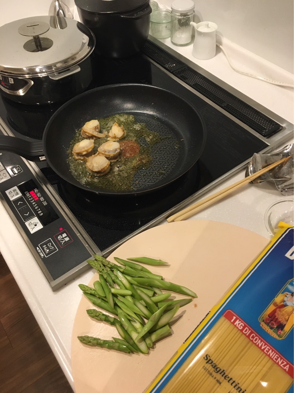 コストコで買ってあった冷凍のホタテと、特売だったアスパラでスパゲティーを作ったそうです。