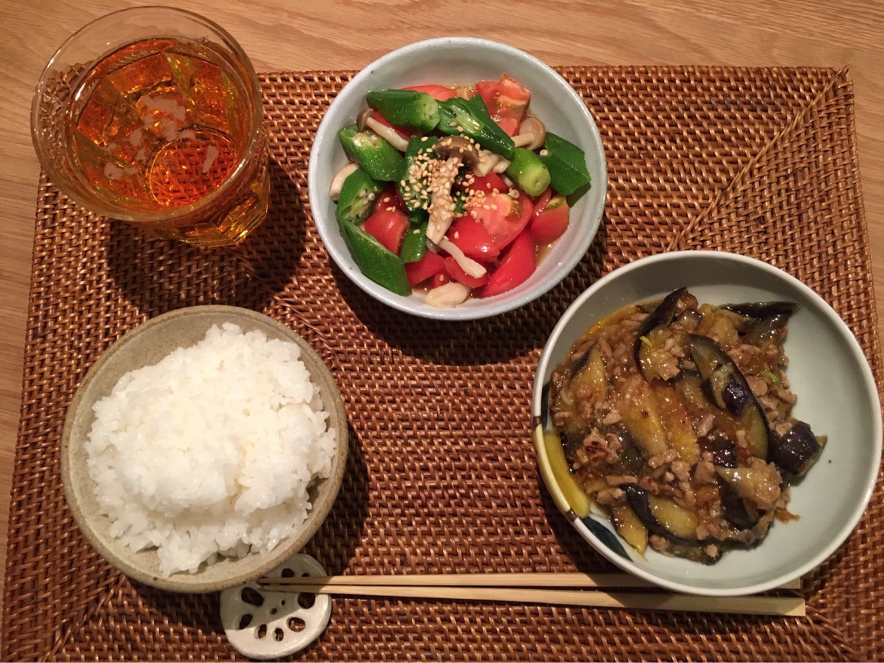 オクラとトマトとしめじの和え物は、めんつゆとごま油で味付けしたそうですー。