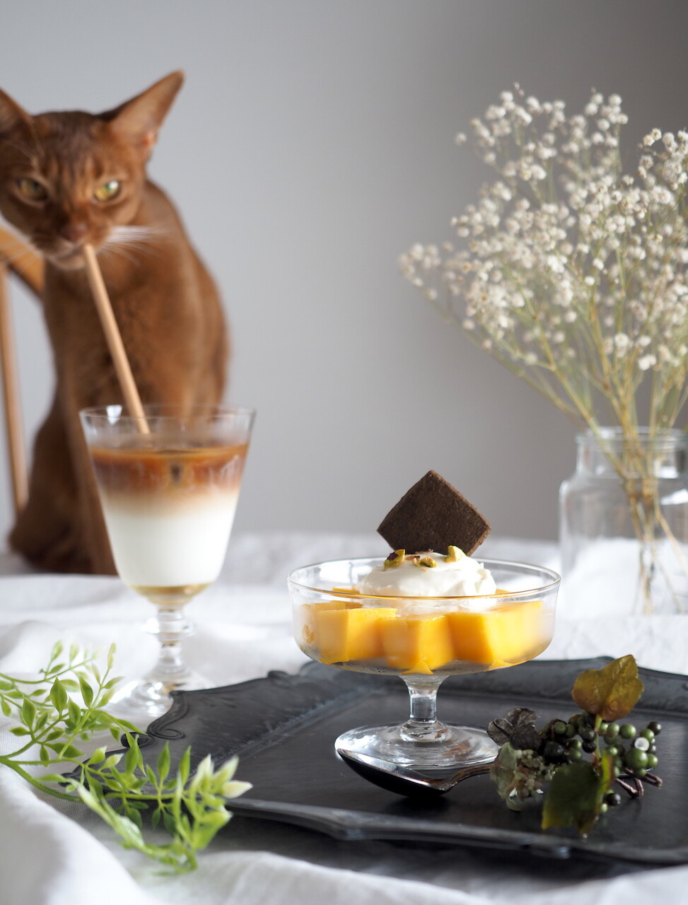 と言っても、アイスの周りにカットしたマンゴーを並べて、生クリームを乗せて、クッキーと砕いたピスタチオをトッピングしただけ♪