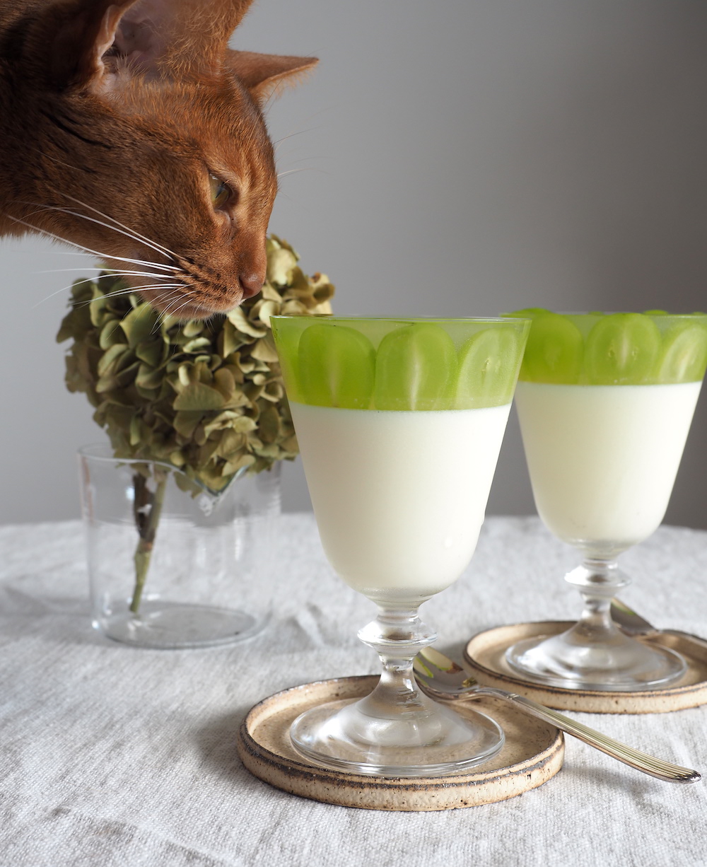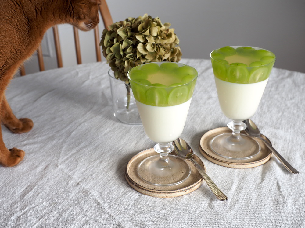 シャインマスカットがだいたいどの辺りになるかを、グラスの外側にマスキングテープで印をつけておいて、その辺りまでパンナコッタを注いで冷やし固めました。