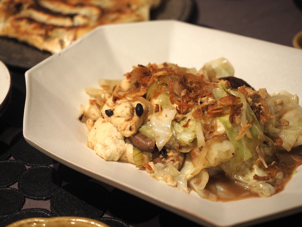 キャベツ、豆腐、玉ねぎ、椎茸を、豆豉ベースの味付けで炒めました。