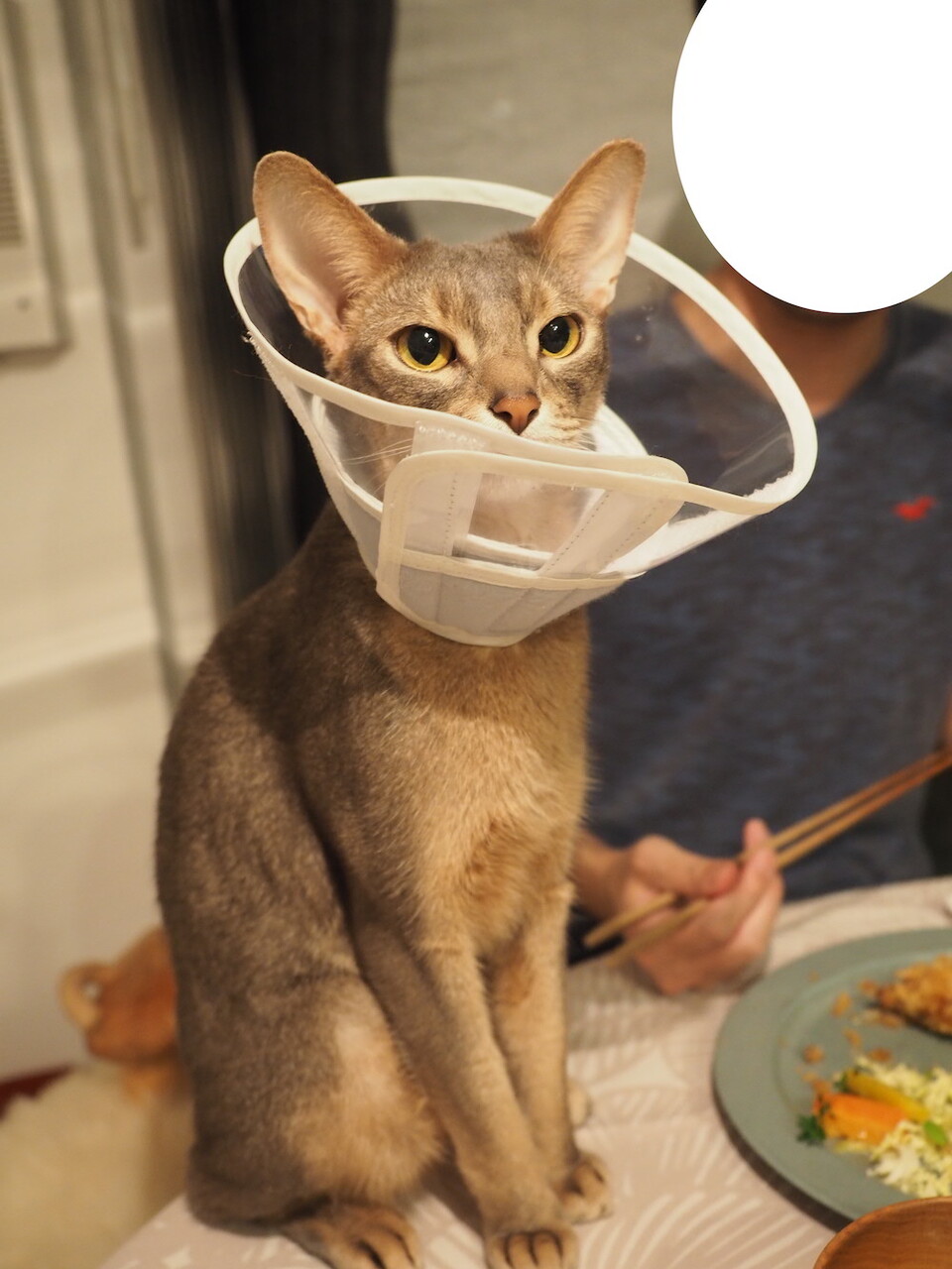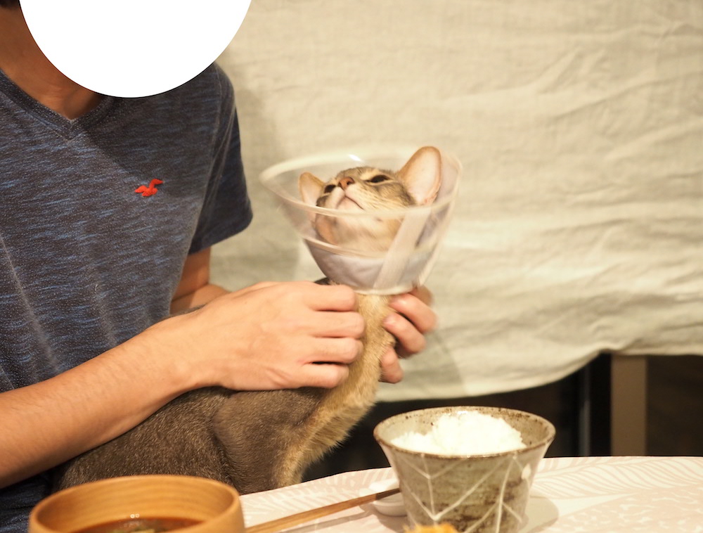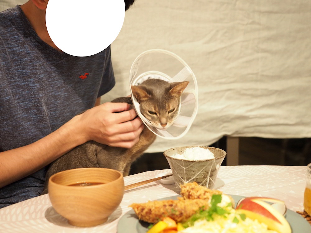じっとりとした目で、コロッケ見てる。