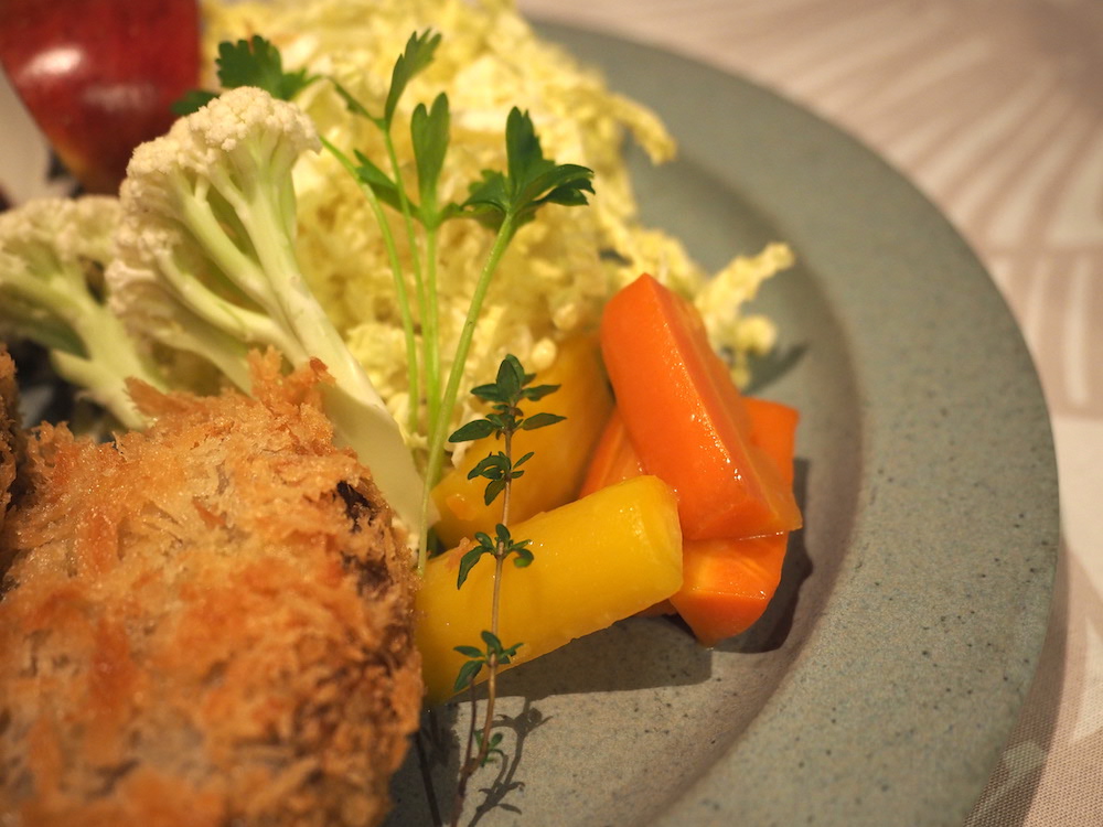 ワンプレートに、コロッケ・キャベツ・人参のグラッセなどが乗ってます。