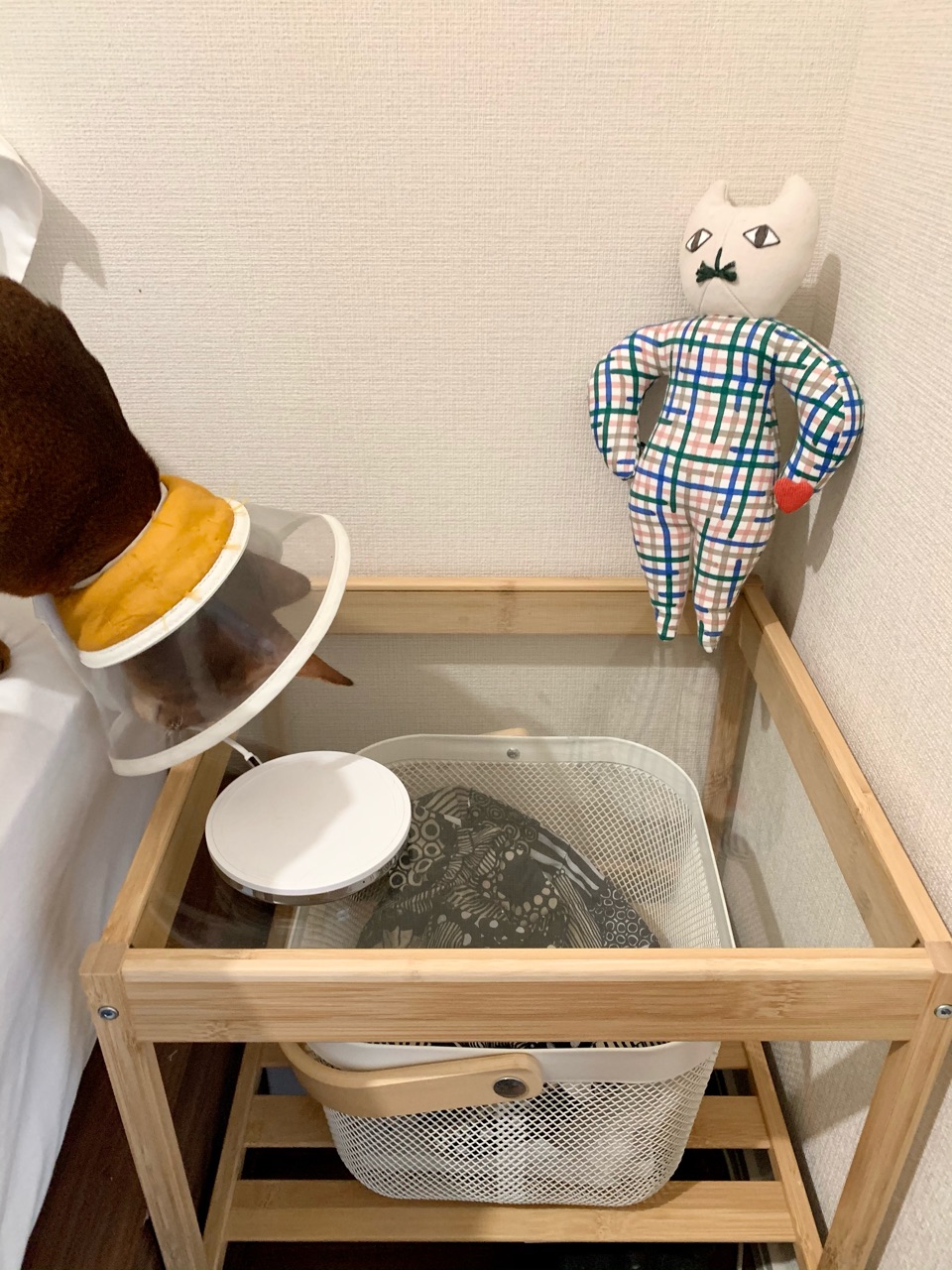 とりあえず、家にあったカゴを置いてあるけど使いづらかったので、違うものを検討してみます。