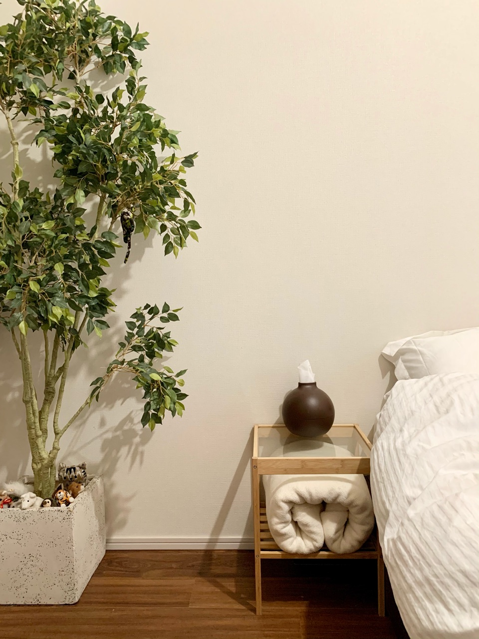 新たに、サイドテーブルを設置して、フェイクグリーンもこっちに移動してみました。