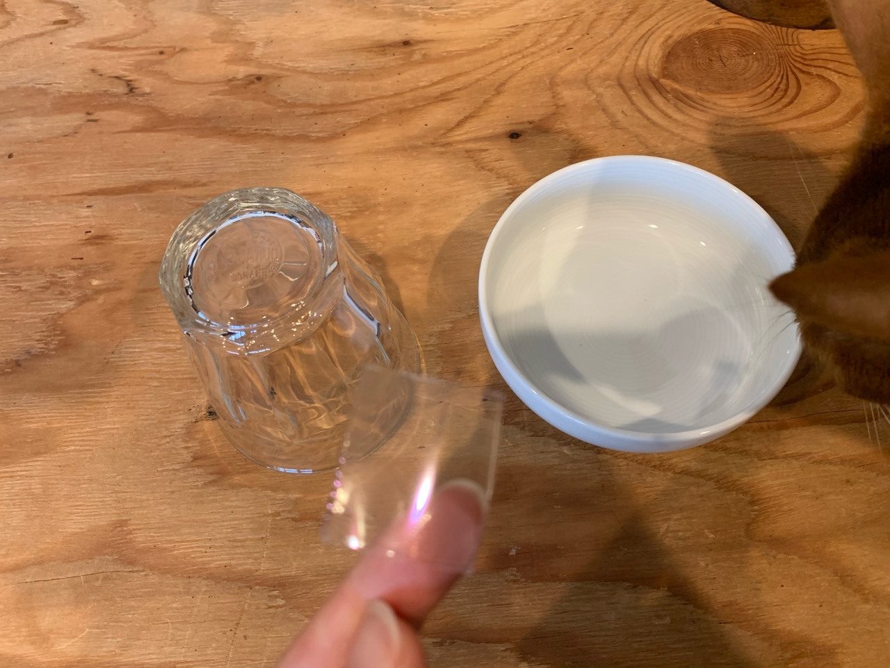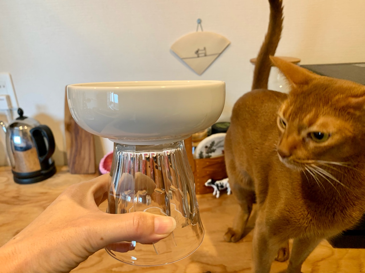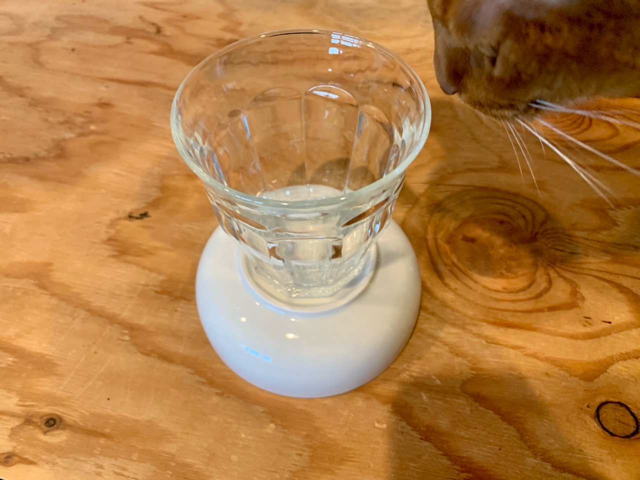 いつものカリカリ入れとグラスをくっつけただけ