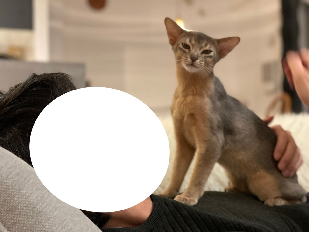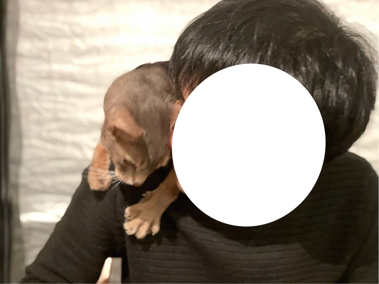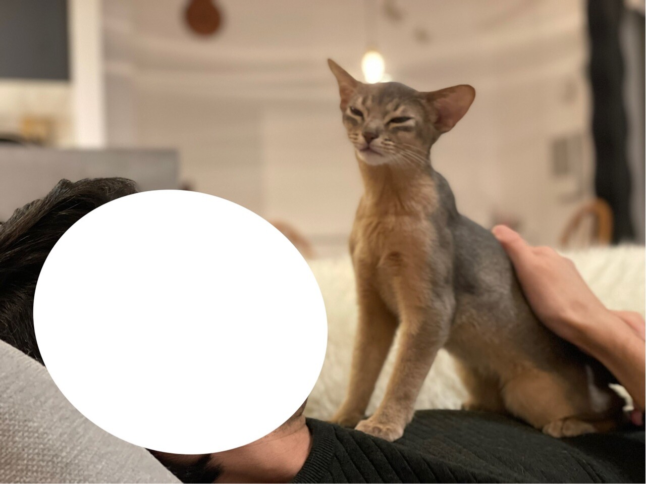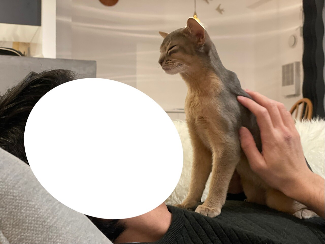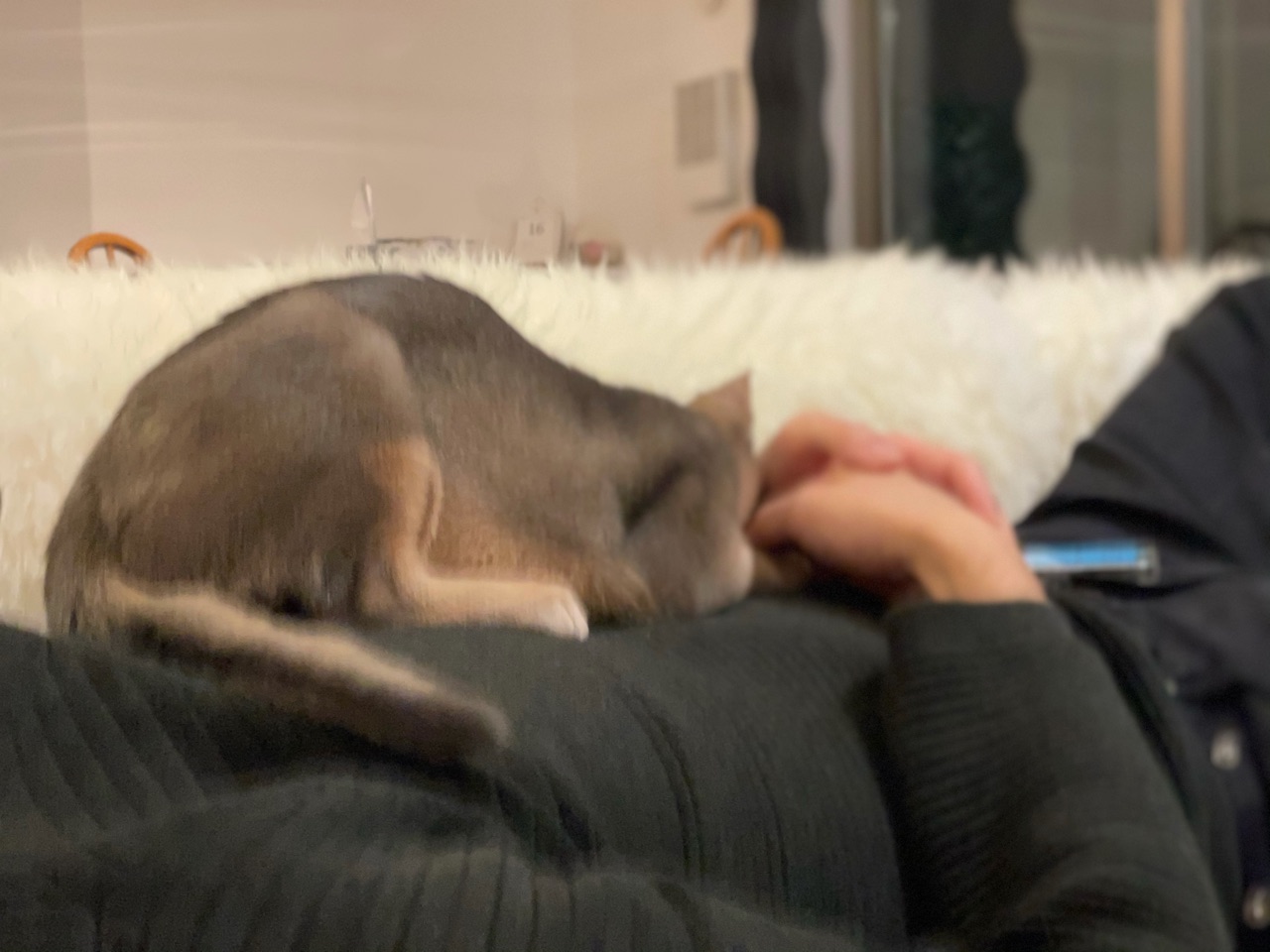 食後のソファーに飛び込んで来たところ。