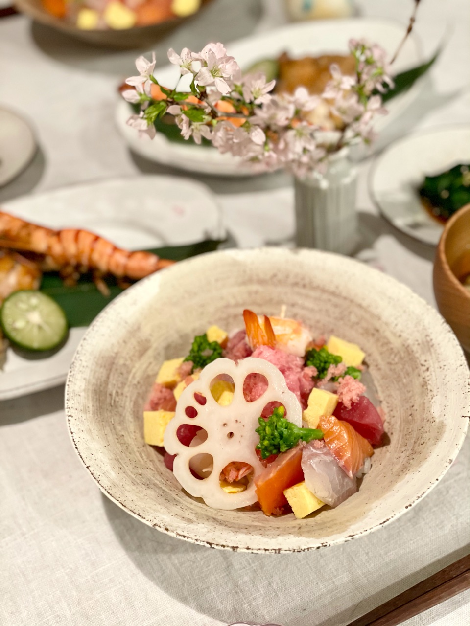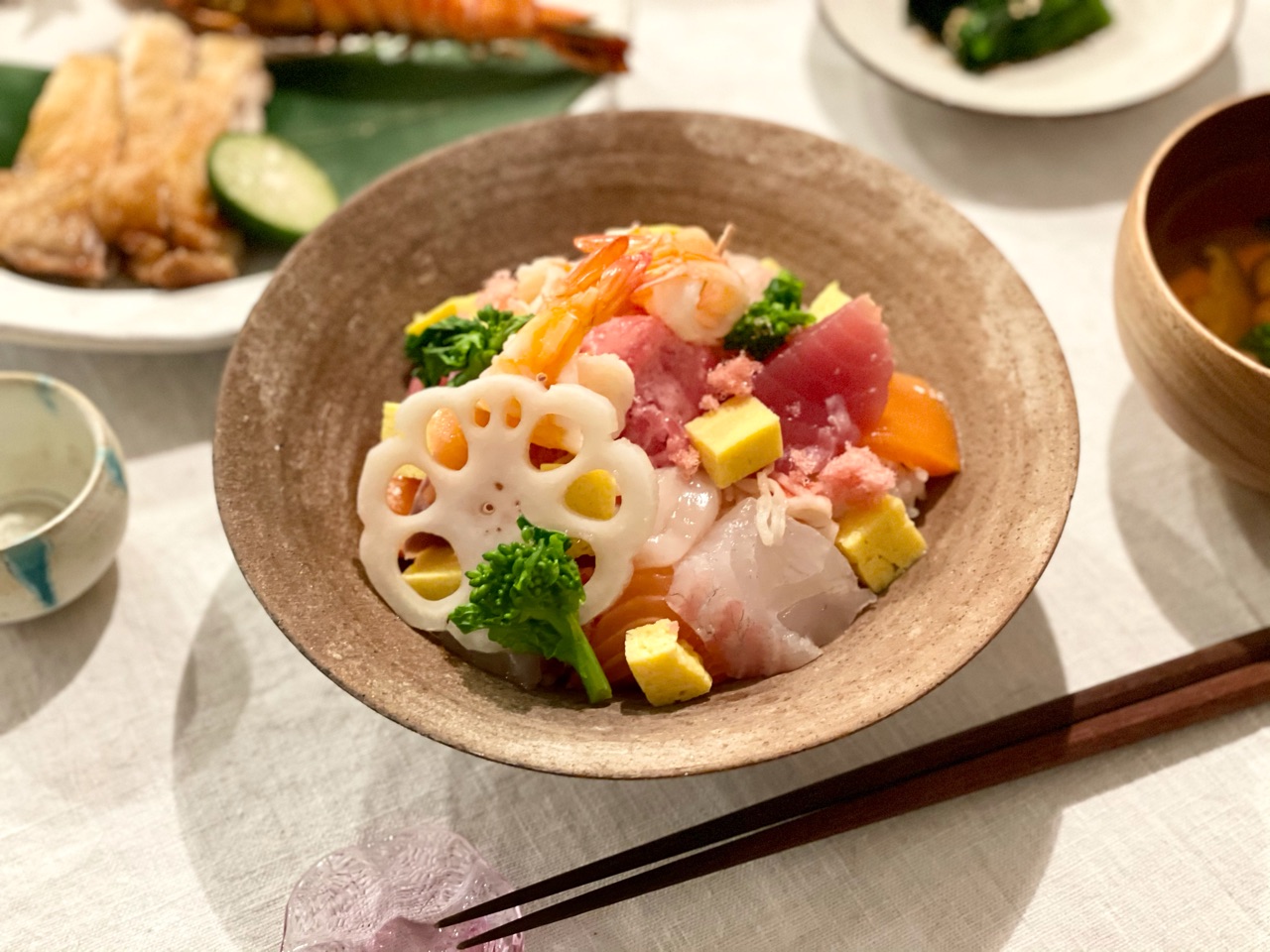 これらを使いたかったので、お刺身を買ってきて、ちらし寿司にしました。