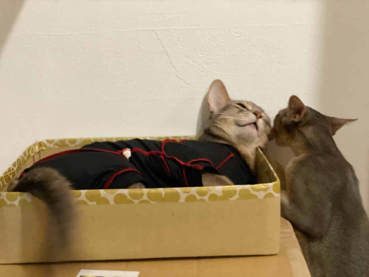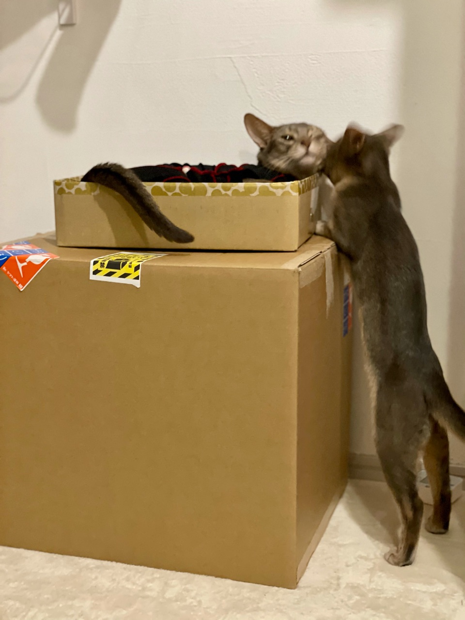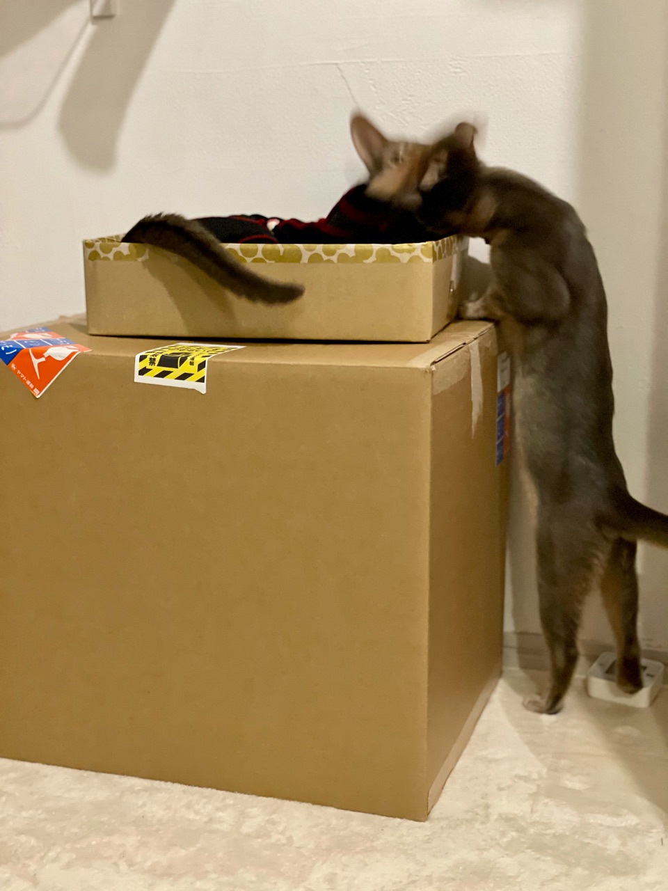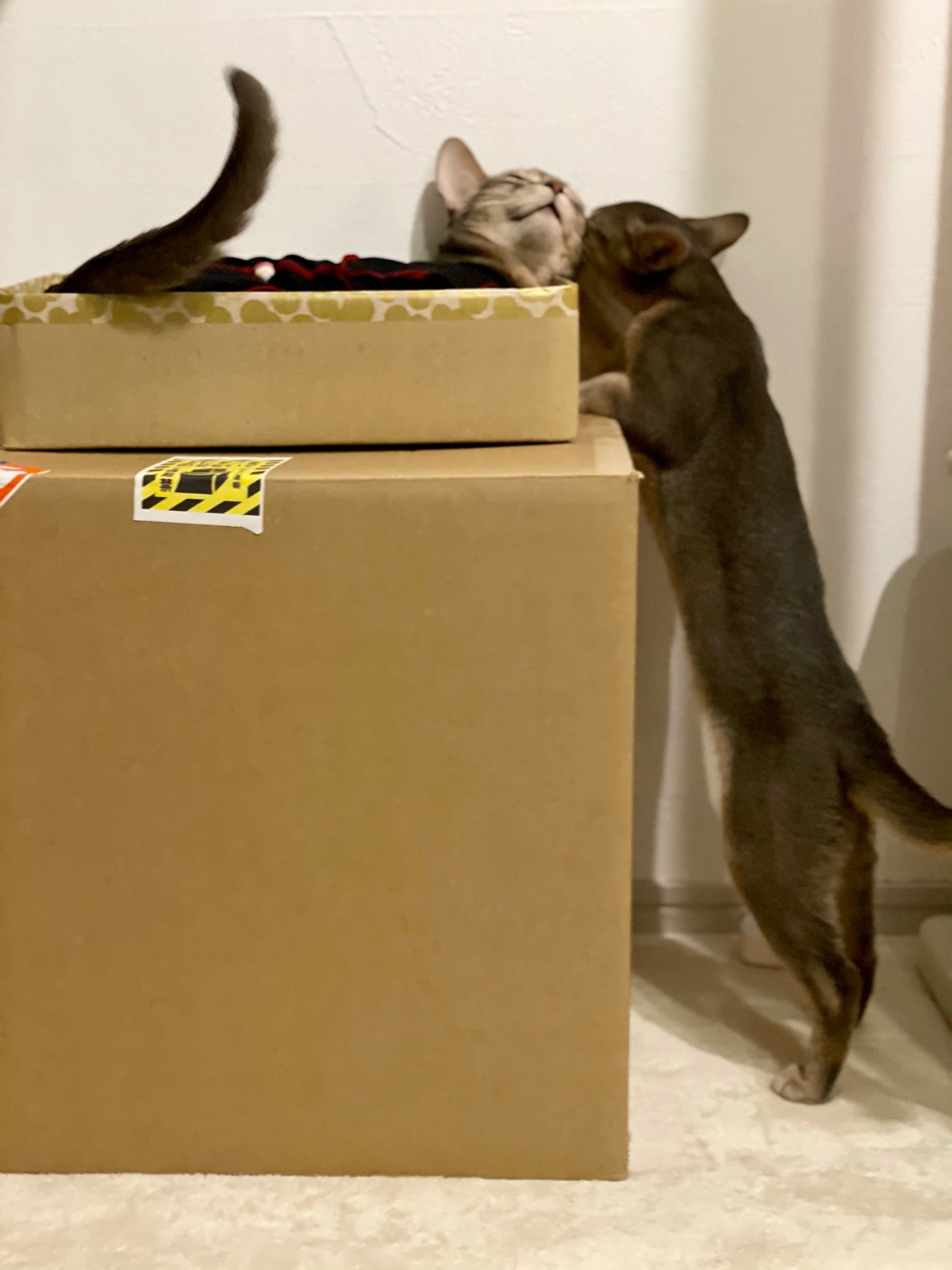 箱に入ったとのを、背伸びしてペロリしてる(*´ω`*)