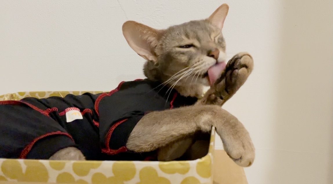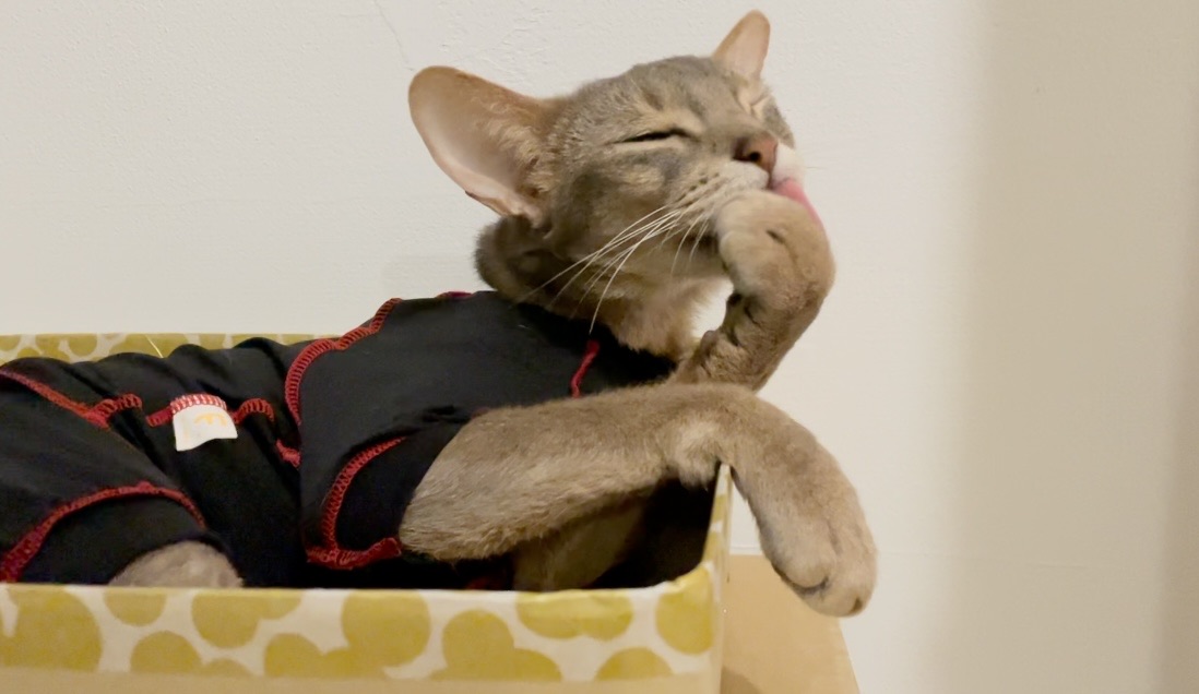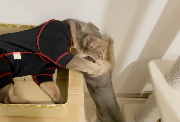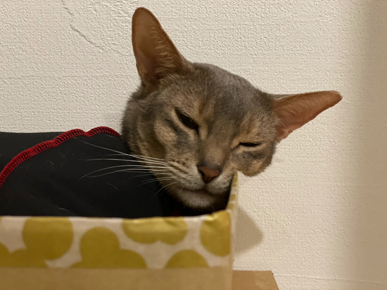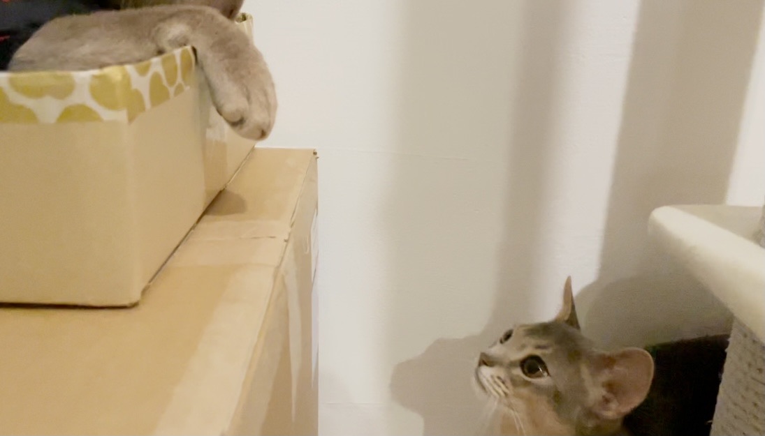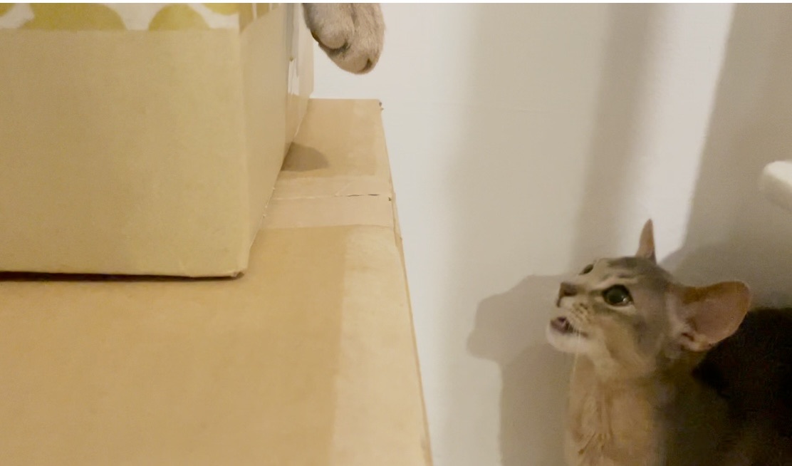 箱に入ったとのを、背伸びしてペロリしてる(*´ω`*)