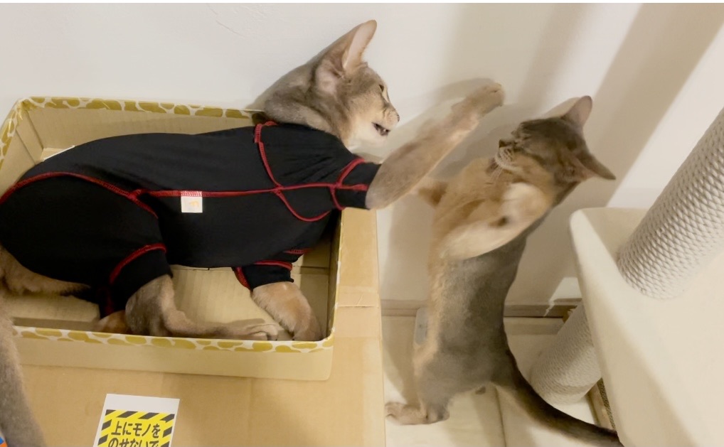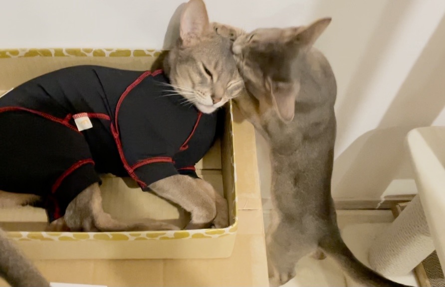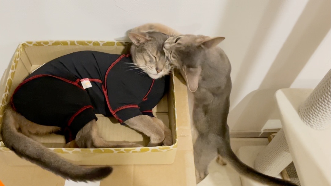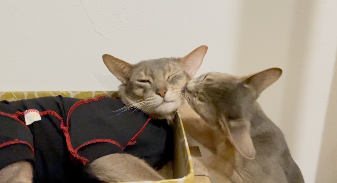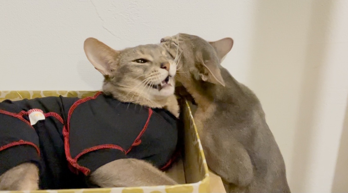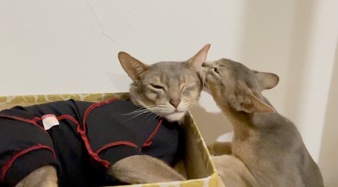 猫の行動学の本には上位の猫が下位の猫を舐める場合が多いと書いてあったような😅