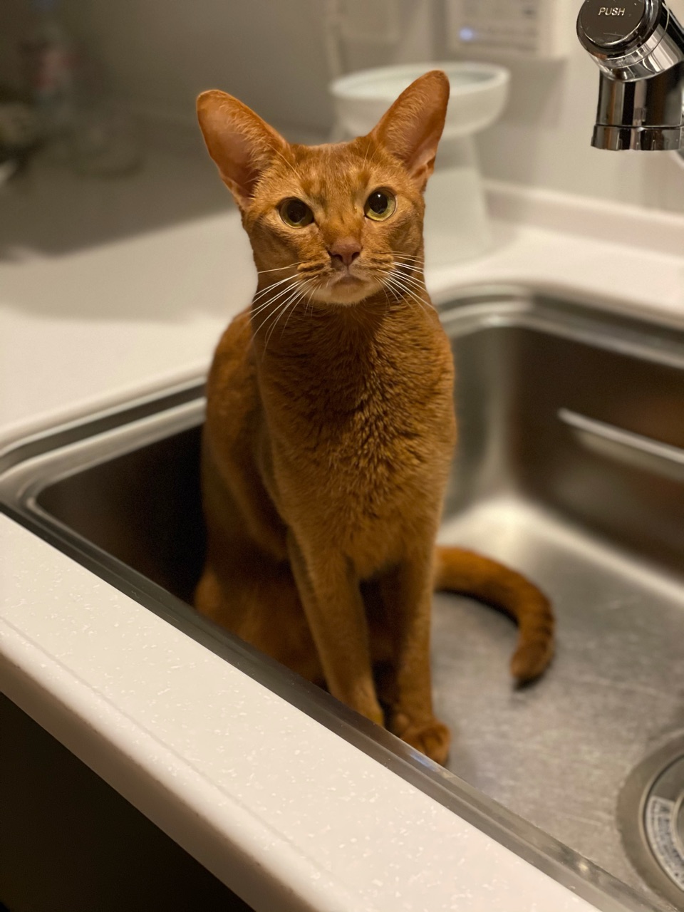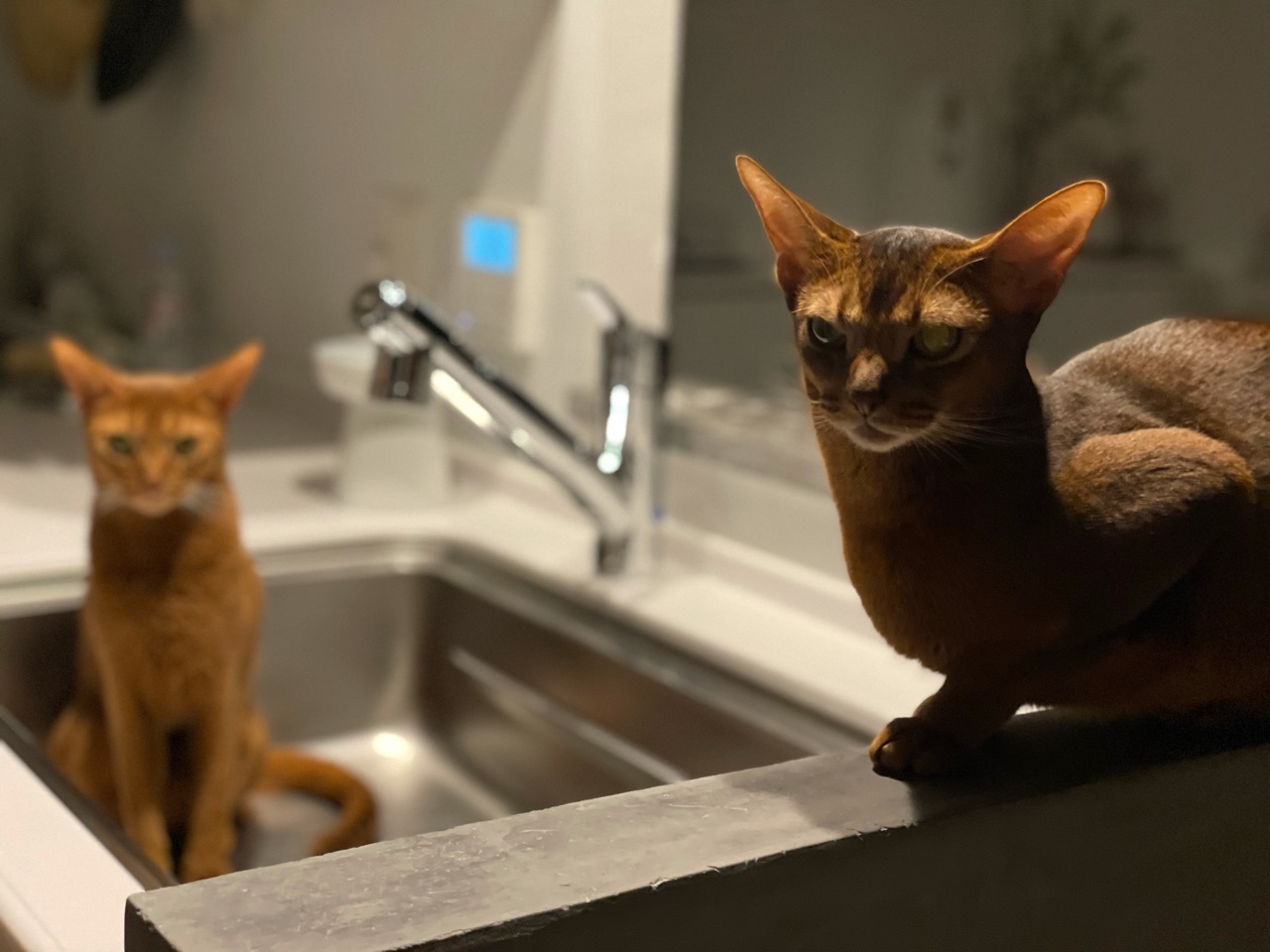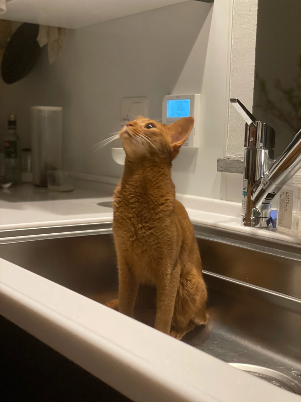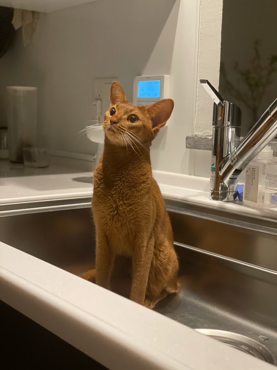 蛇口のお水を飲みたいひめちゃんが、蛇口先前線で座り込みをしている。