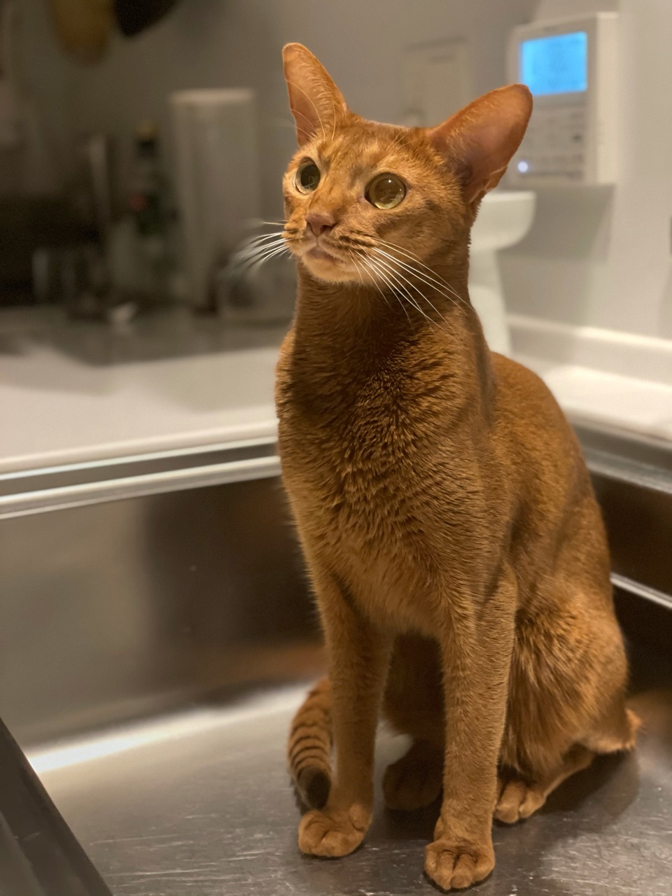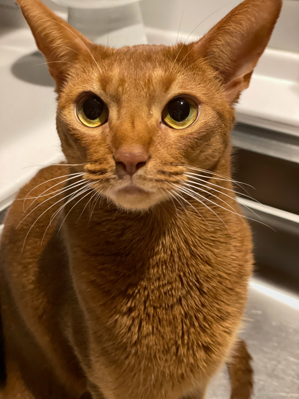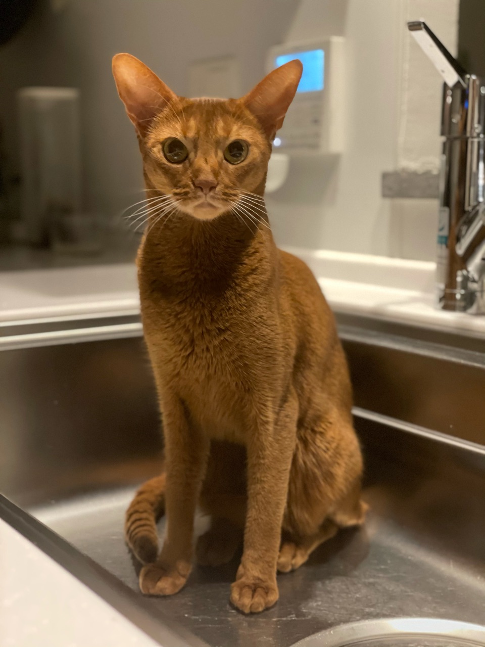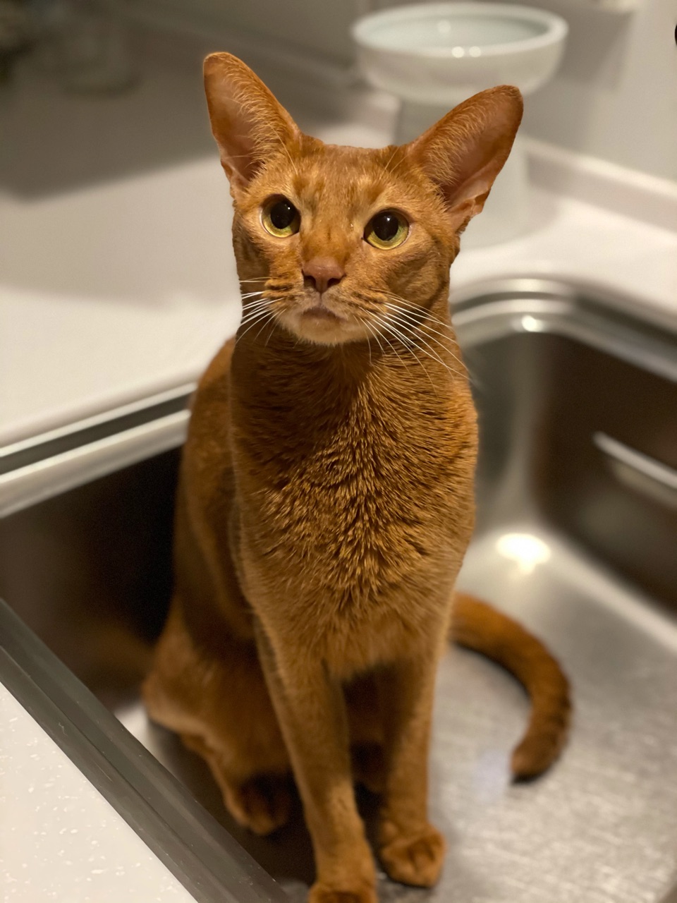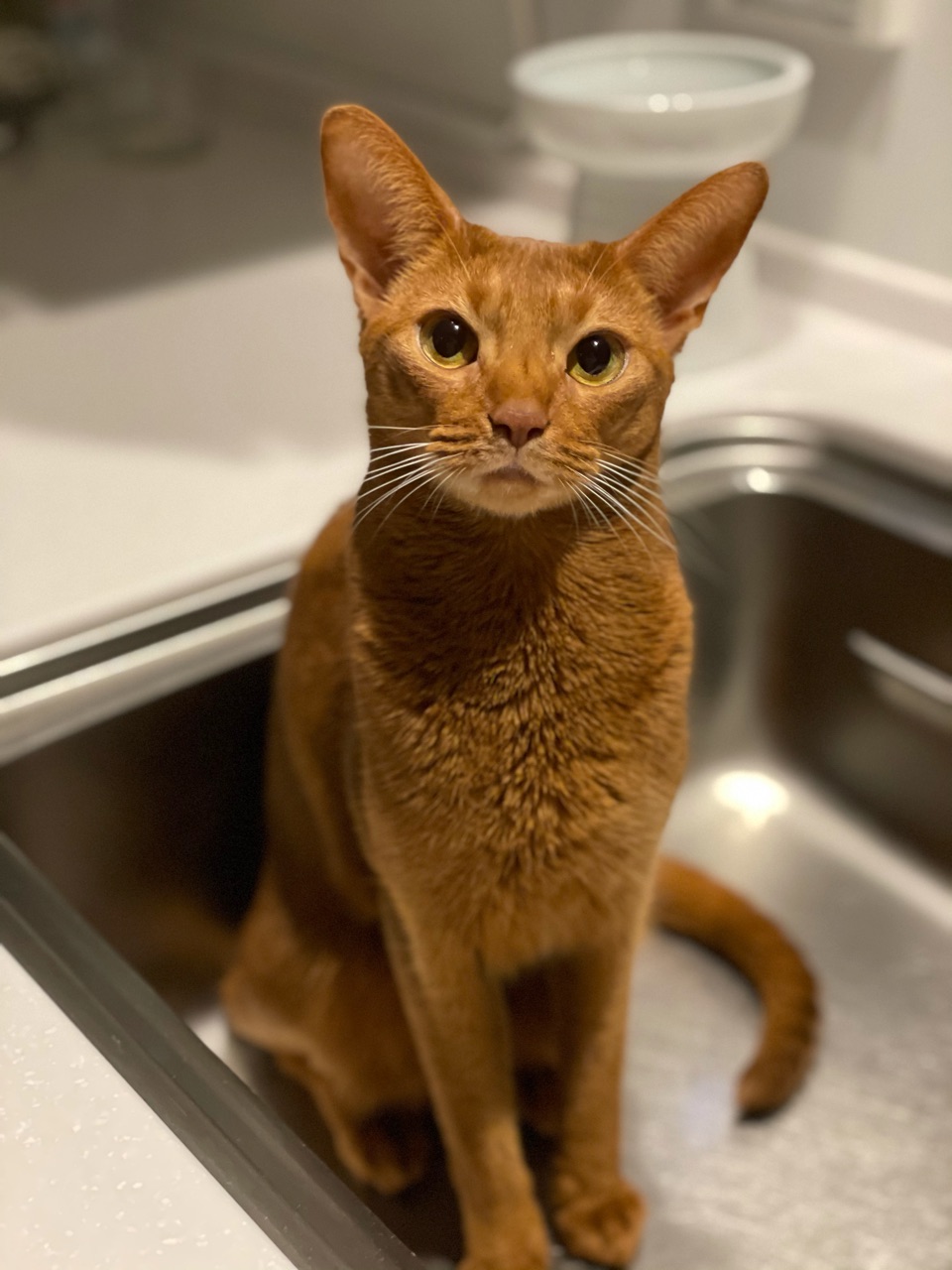 蛇口のお水を飲みたいひめちゃんが、蛇口先前線で座り込みをしている。