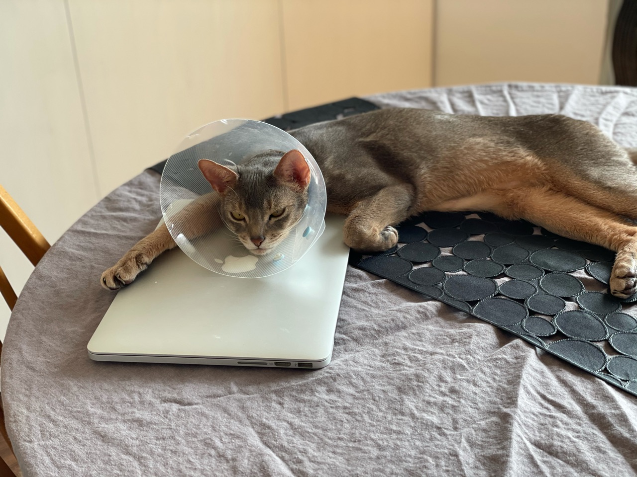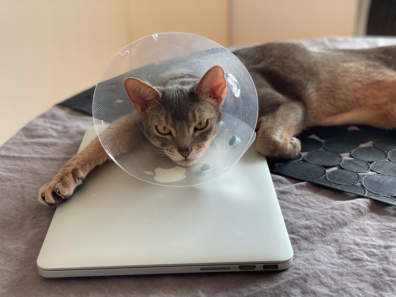 お洋服の上から舐めて、なかなか傷が良くならないのでカラーにしたぼくちん。