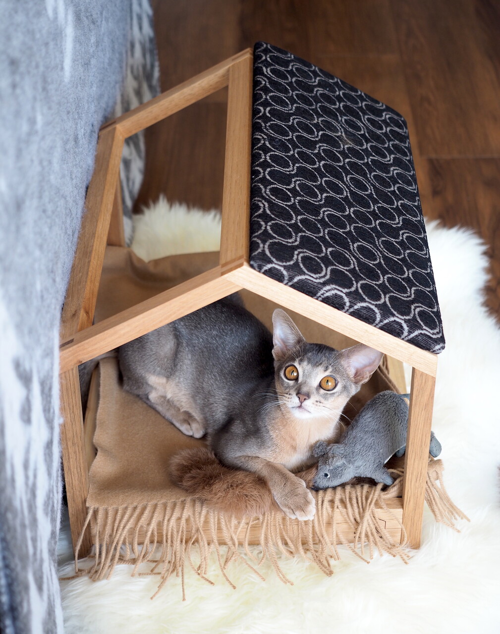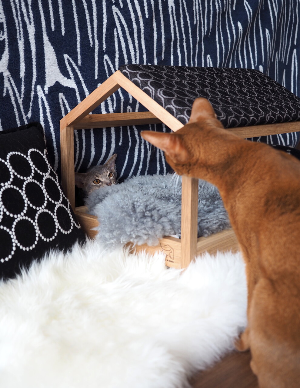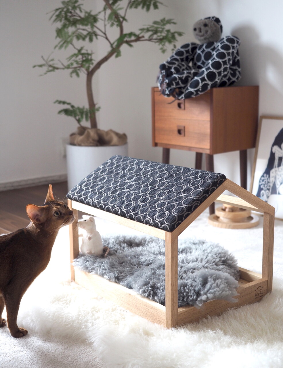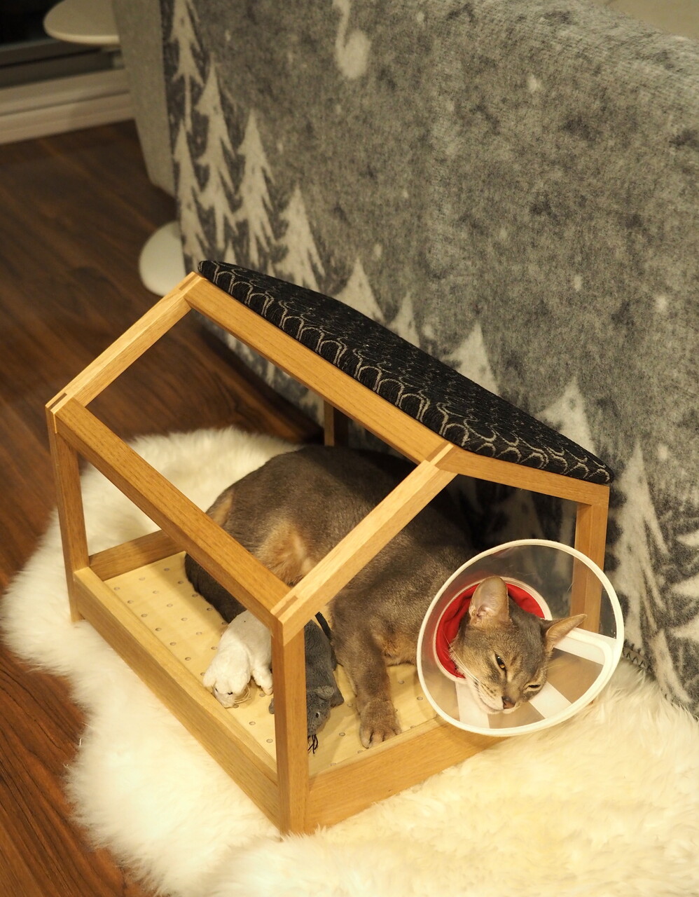 我が家が選んだ「スケルトンハウス」のおにぐるみと、「爪とぎ屋根」のブラックファブックで組み合わせたのがこちらです。
