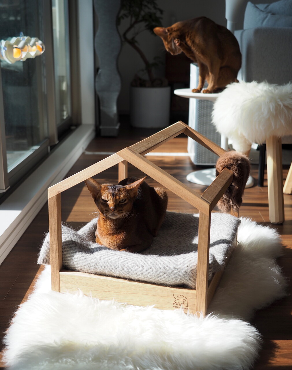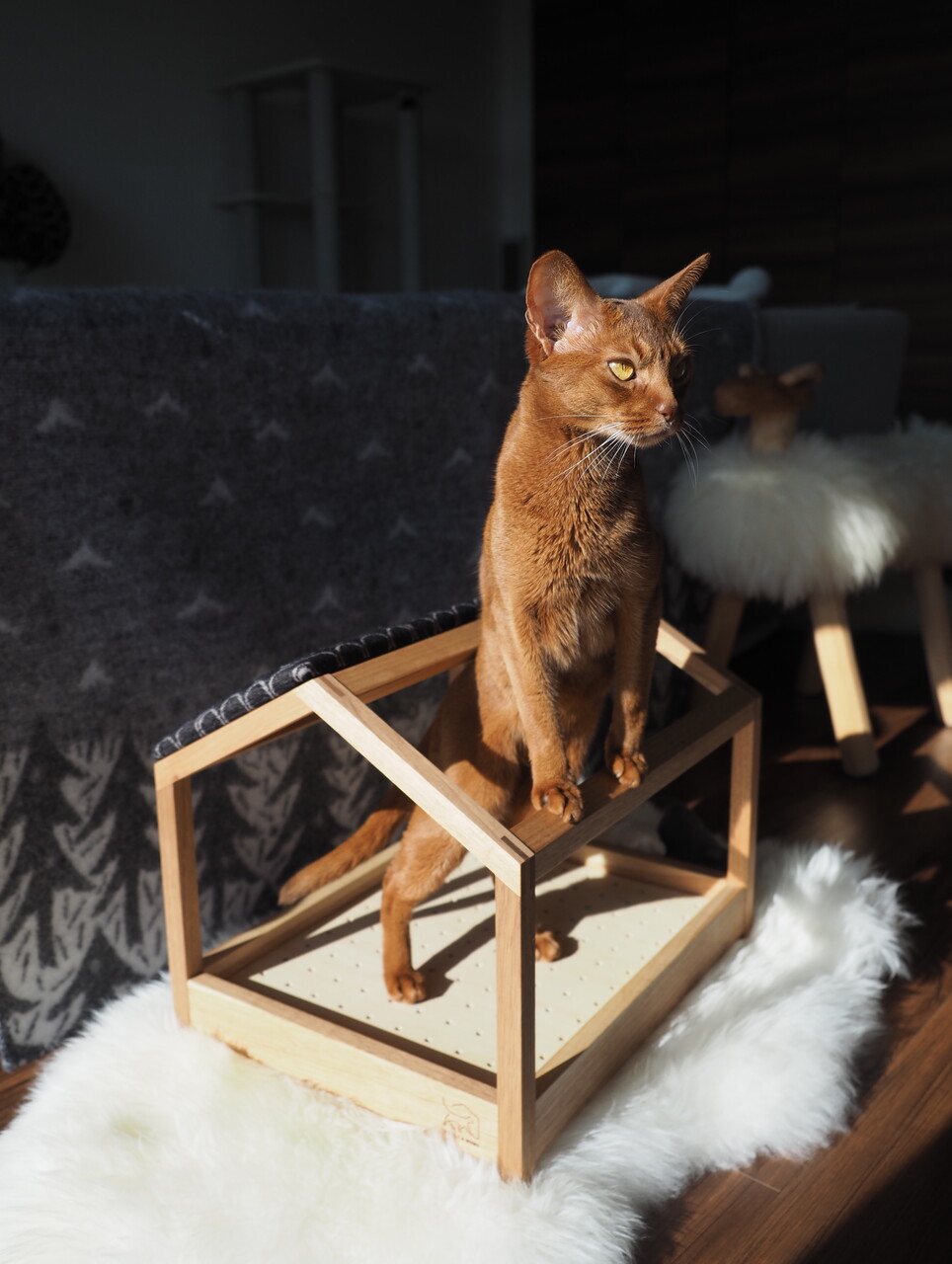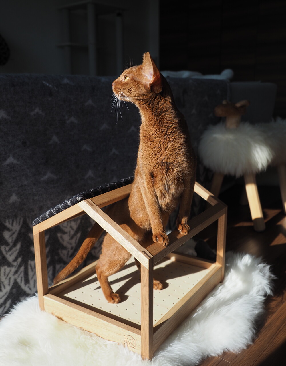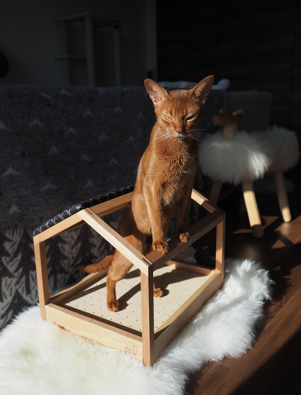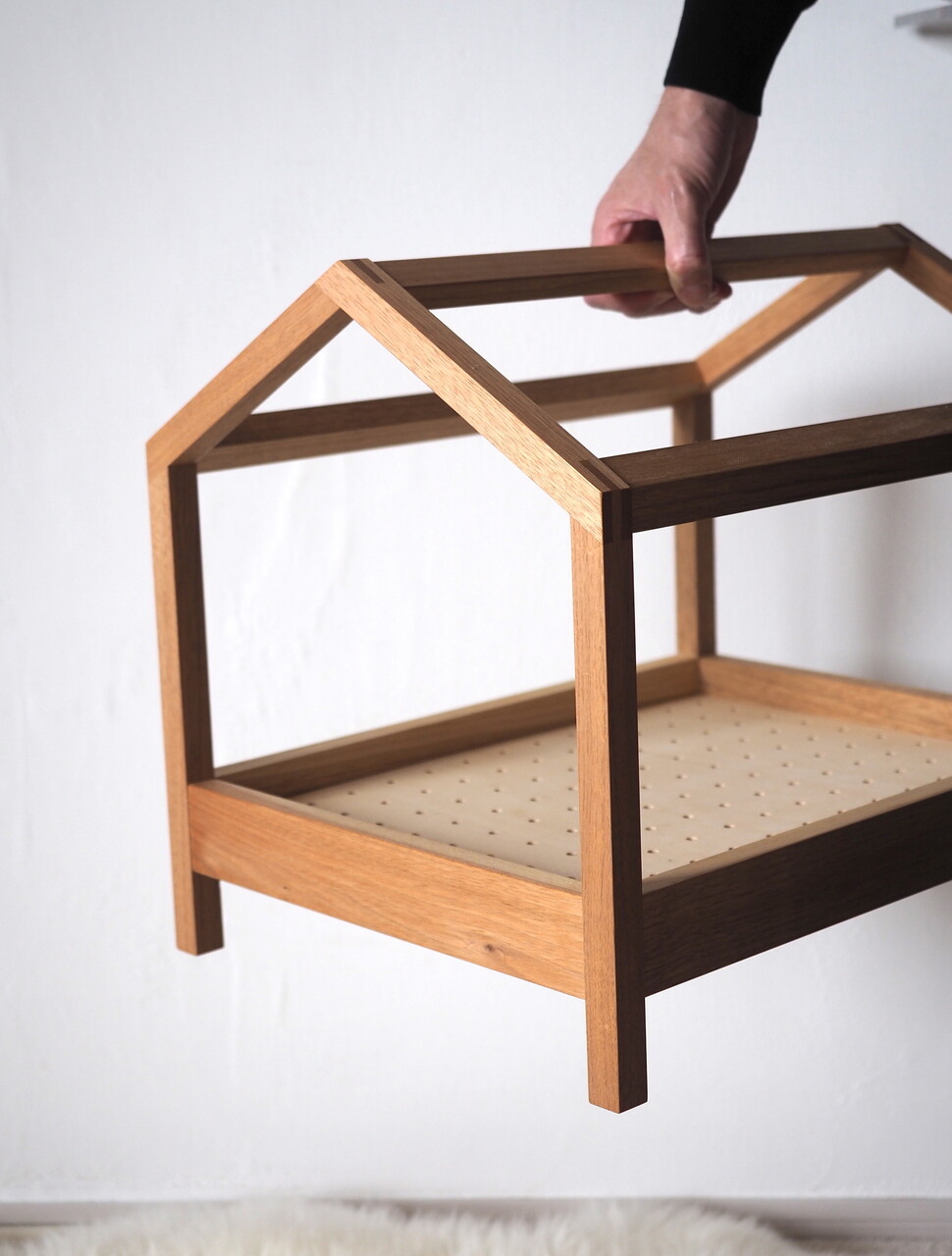 大切な猫さんが長い時間を過ごす場所ですから、安心な素材と安全な構造が重要です。日本の管理された山で育った木材を、しっかり管理された場所で乾燥させ、赤ちゃんの玩具に使う植物性の塗料で仕上げをしています。 私達が感じるような薬品の臭いなんて、もってのほかだと考えています。保管もスモーキングフリーの環境で、匂いに敏感な猫さんの事を考えて管理しています。自然の木の香りを楽しんで欲しい、無垢材の家具ならではの楽しみです。