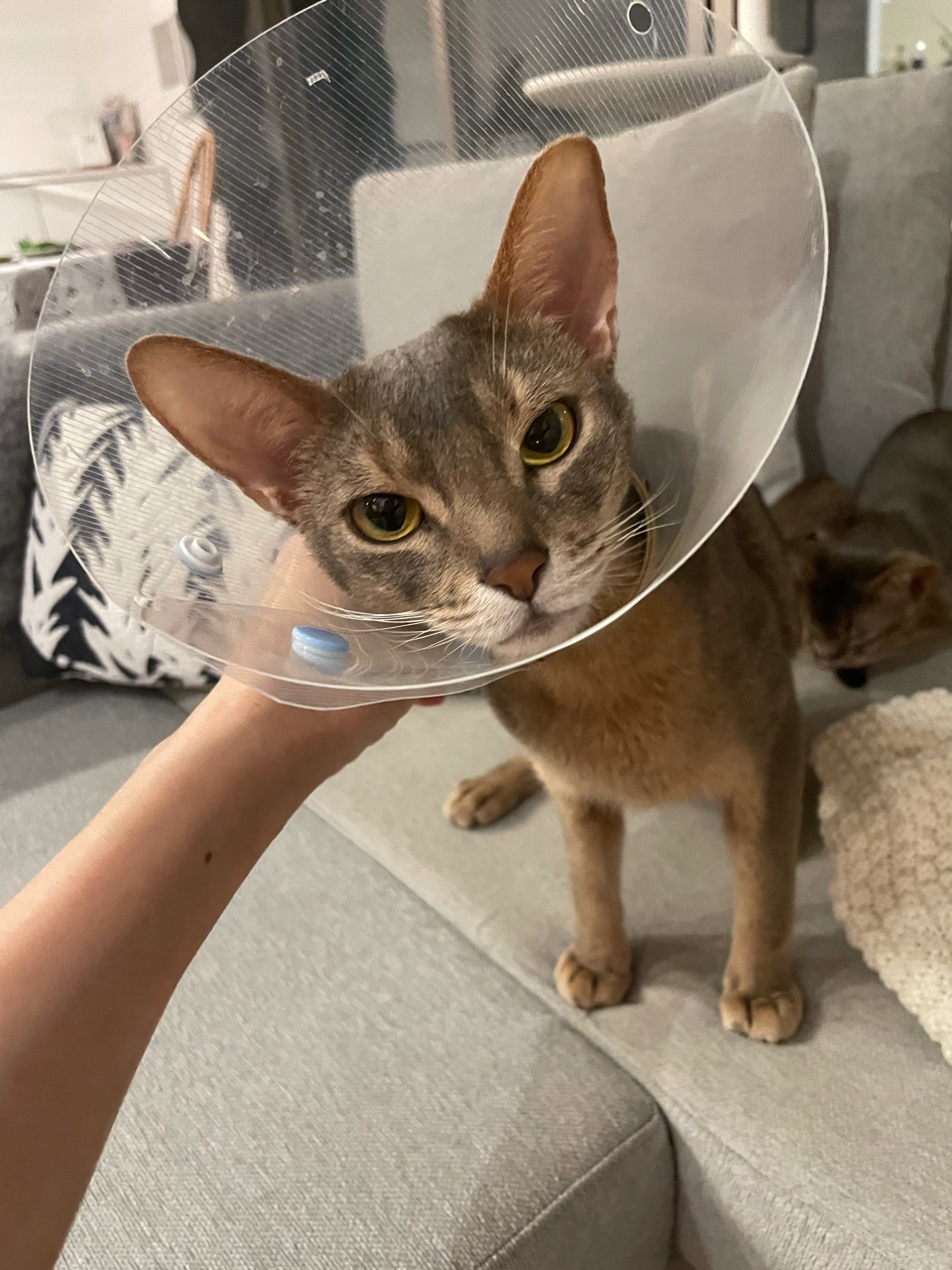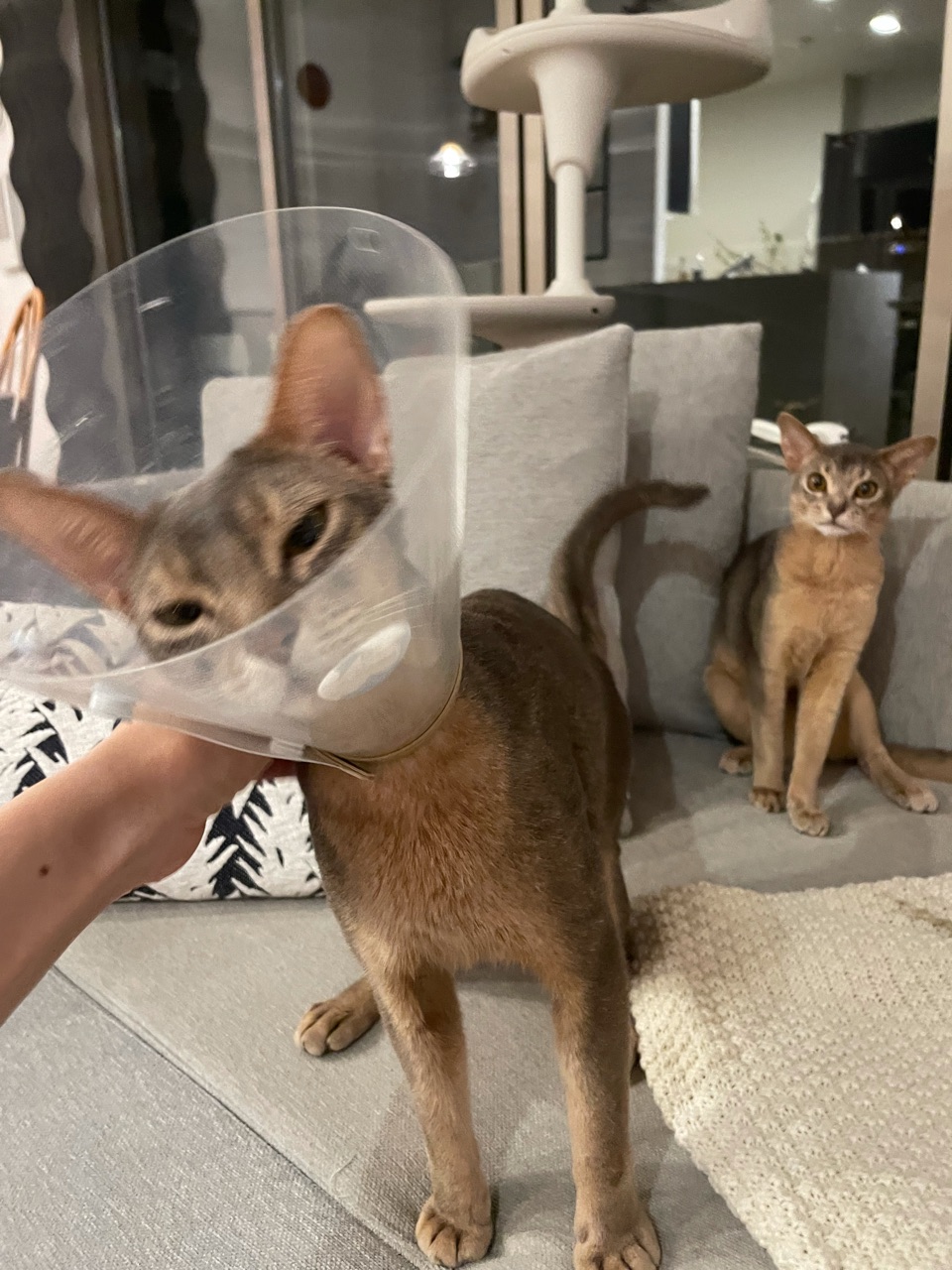 それで、いつもの「ねこずき」さんのカラーにしていたんですけど、それだと舐め壊した場所に余裕で届いてしまっていたので、りす子が目を掻かないように病院で処方された開きの少ないエリザベスカラーにチェンジしています。