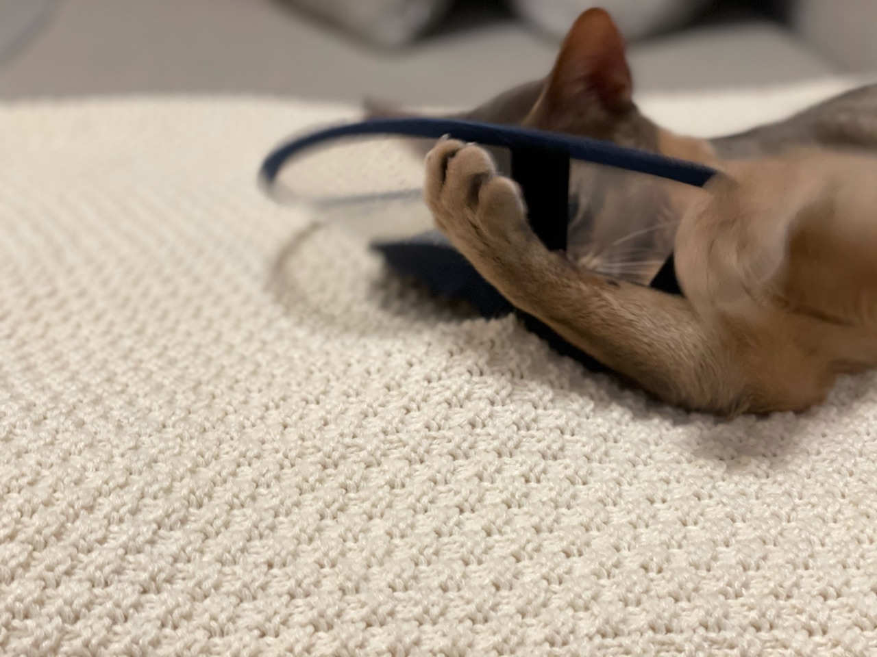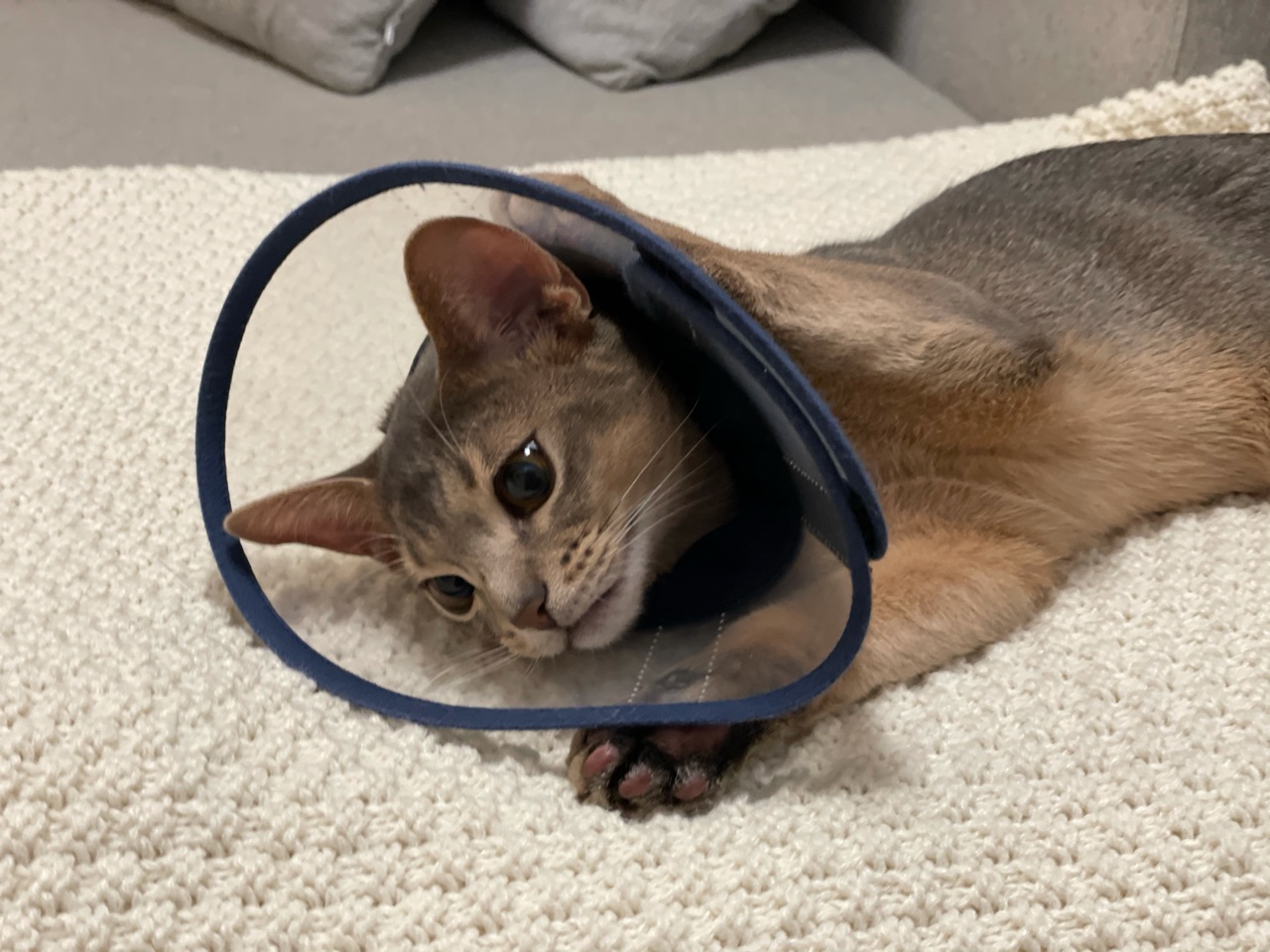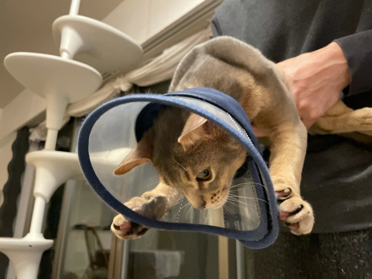 保護服やエリザベスカラーで傷口を舐めないようにしないとならないんですが、わかはどうやらカラダの違和感にめちゃめちゃ敏感。