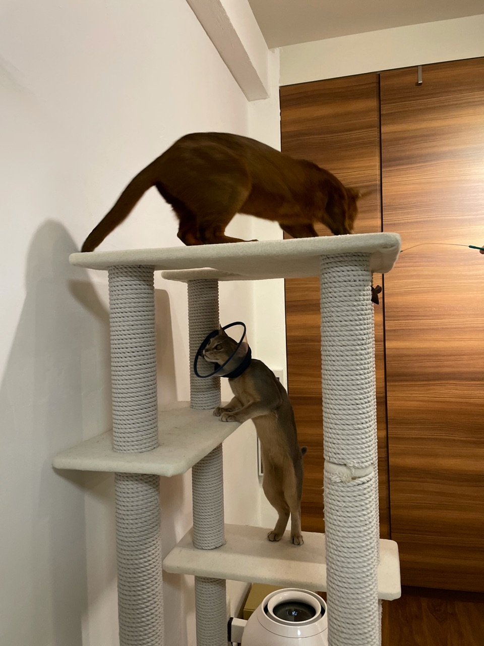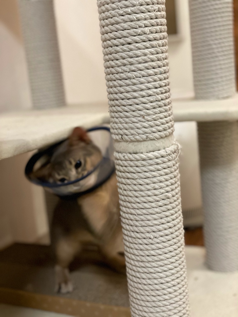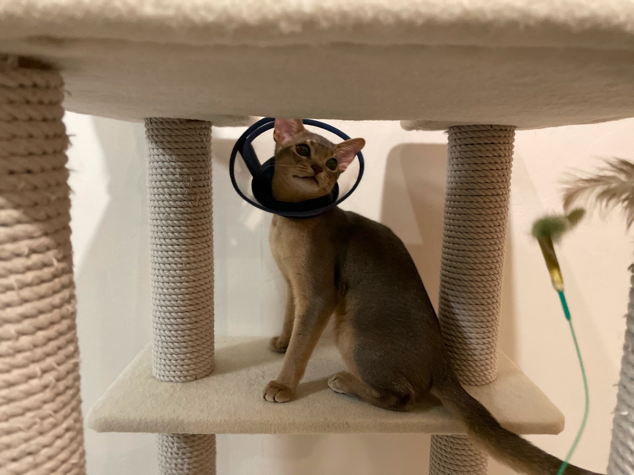保護服やエリザベスカラーで傷口を舐めないようにしないとならないんですが、わかはどうやらカラダの違和感にめちゃめちゃ敏感。