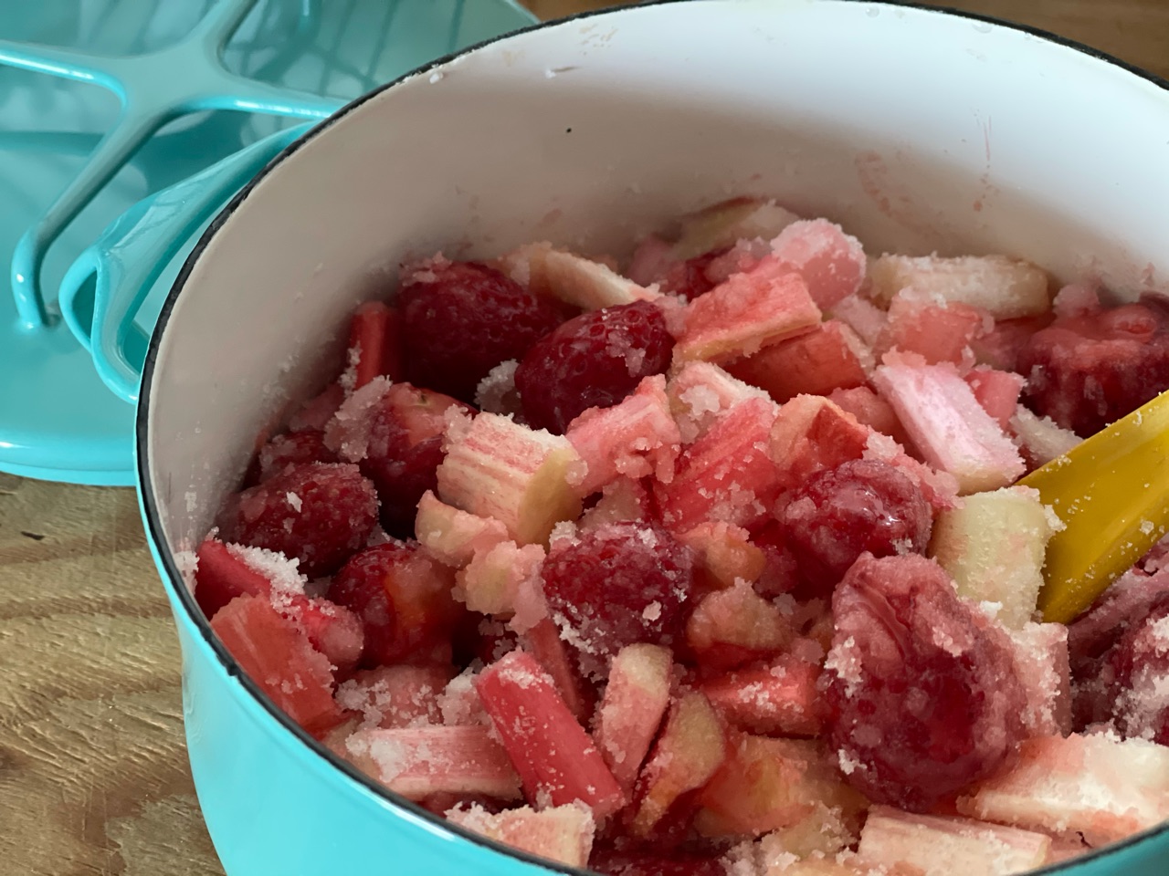 ルバーブを2〜3cmくらいの長さに切って、ヘタを取ったイチゴと一緒にお鍋に入れて、お砂糖を全体にまぶして1時間以上置きます。(浸透圧によって素材から水分が出てくる)
