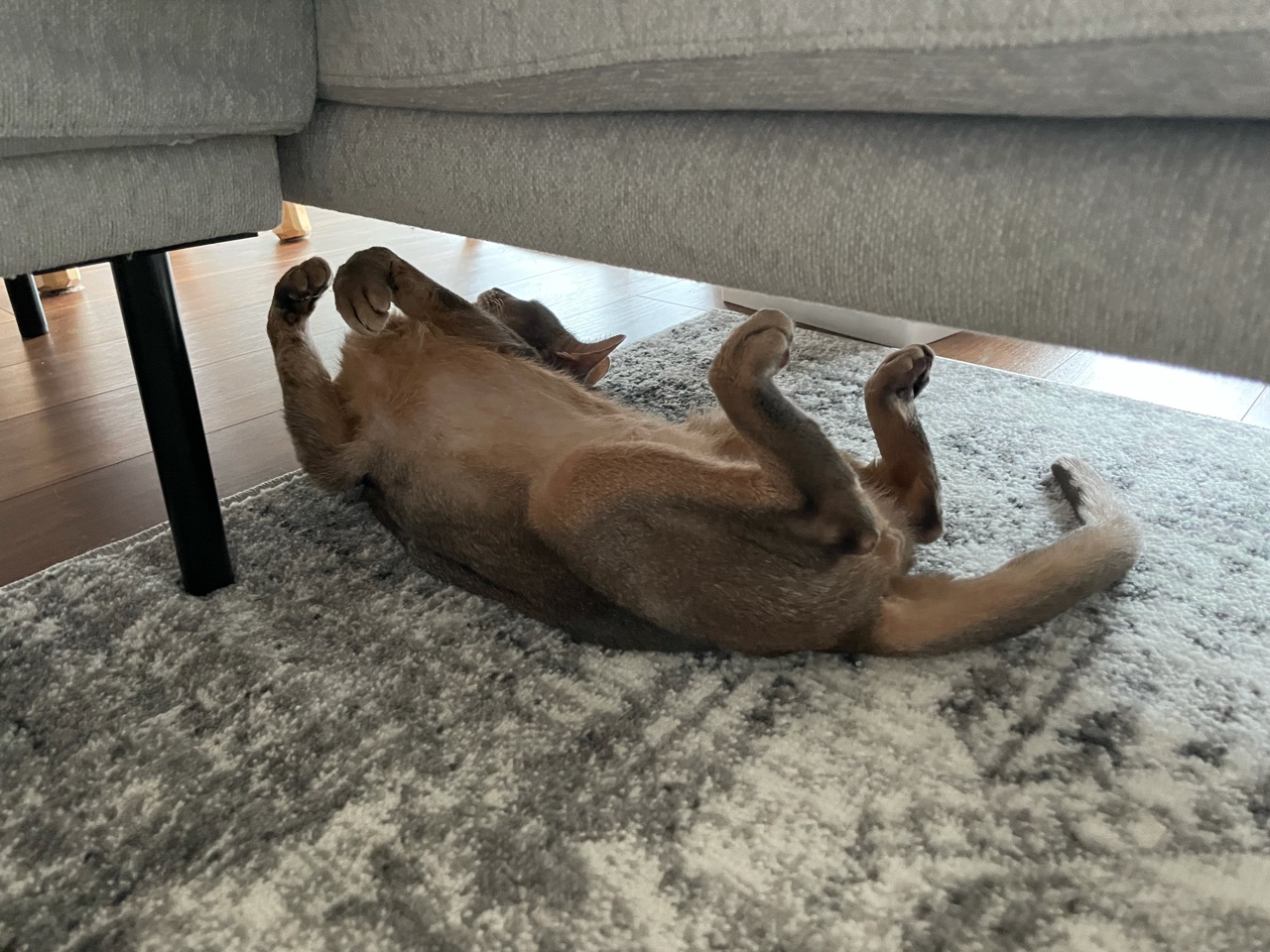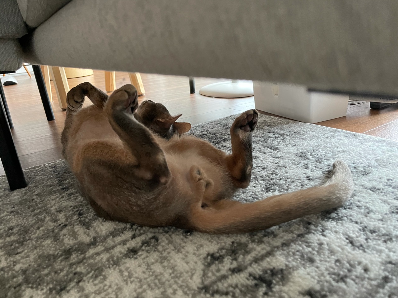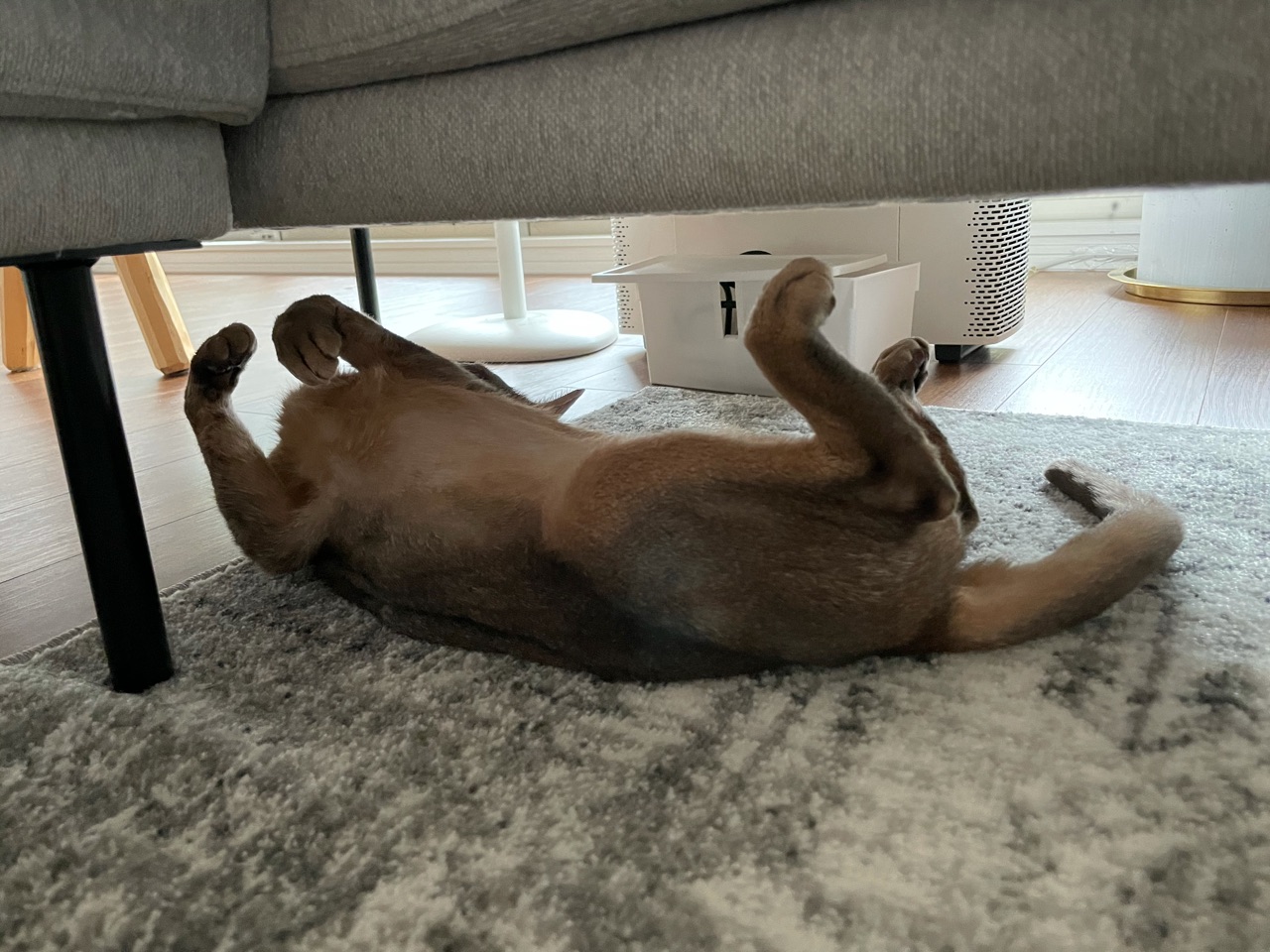 場所を取られたぼくちんは、ソファーの下でひっくり返ってた。