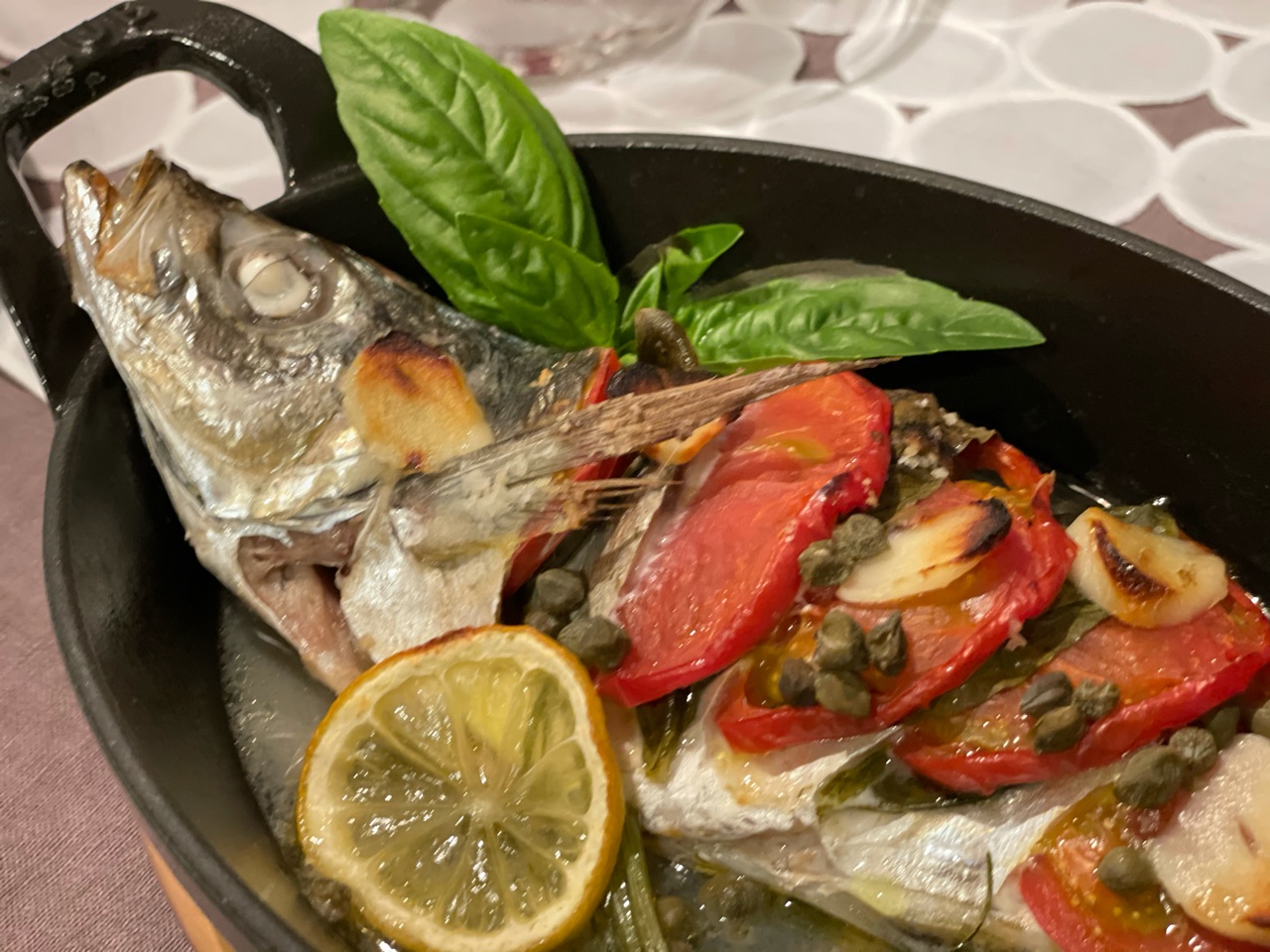 斜めに切り込みを5箇所くらいいれて、トマトとバジルを挟んで、ニンニク、オリーブオイル、お塩、ケーパーをかけて、オーブンのグリルで焼きました。