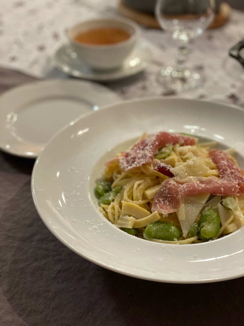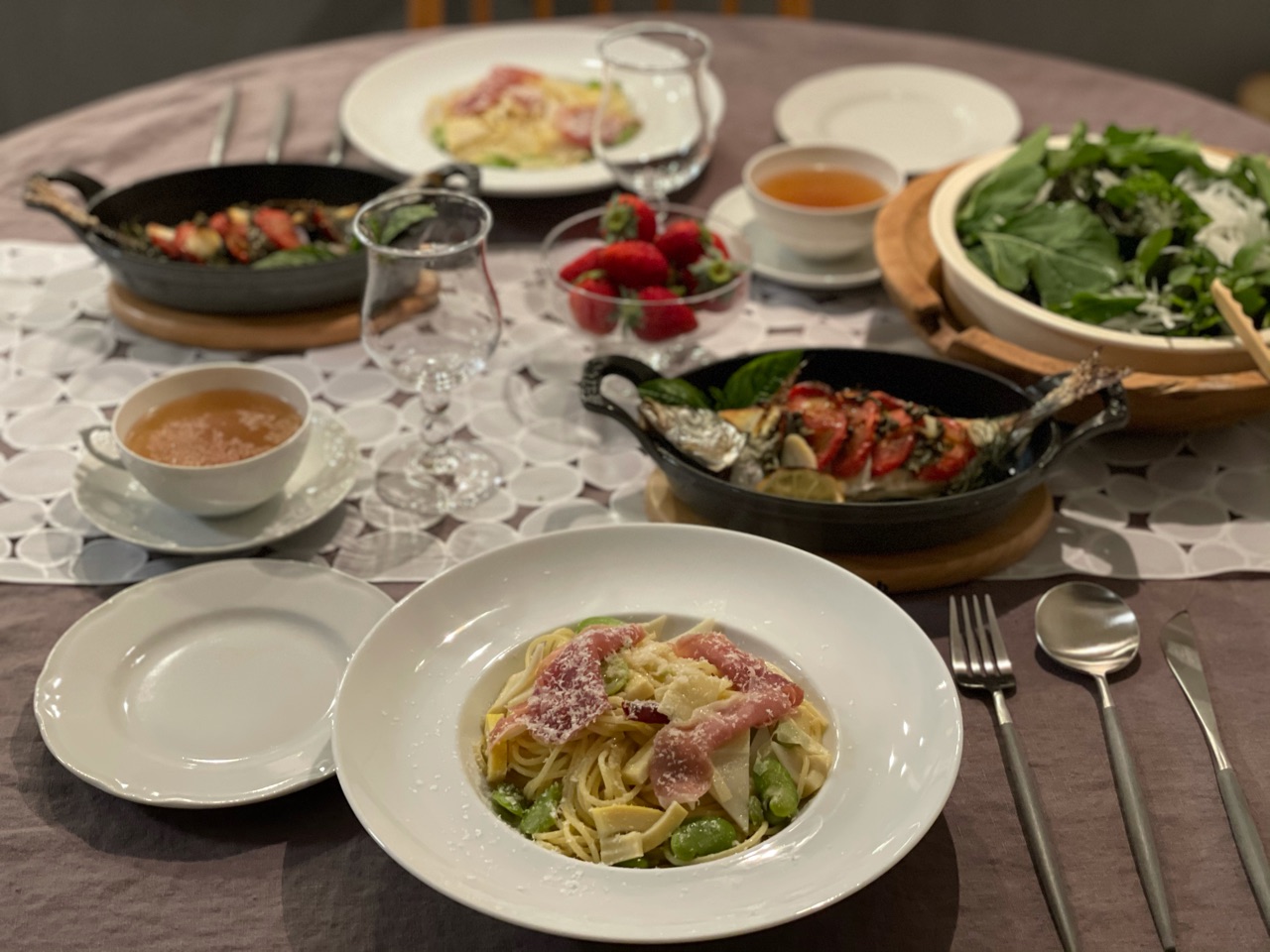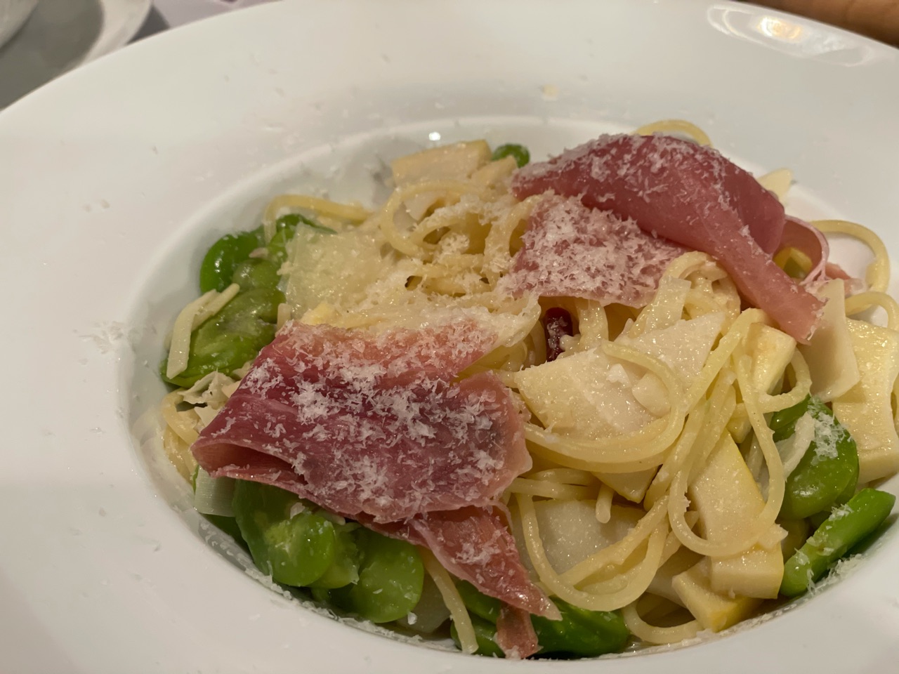 3日目は、タケノコとそら豆ペペロンチーノを、だんなさまが作ってくれました✨