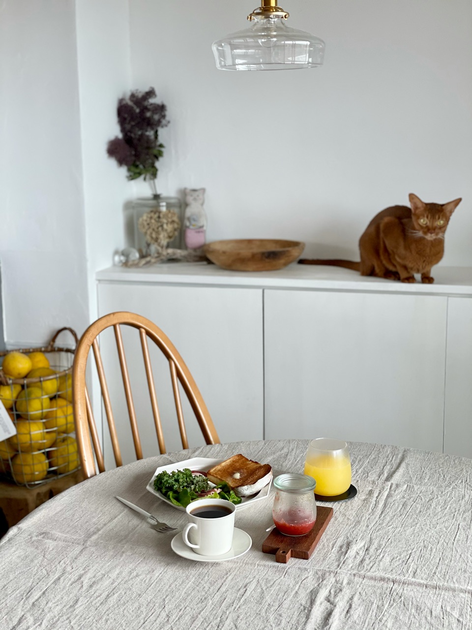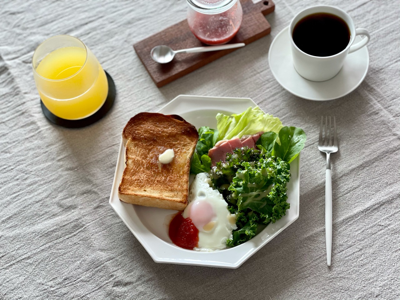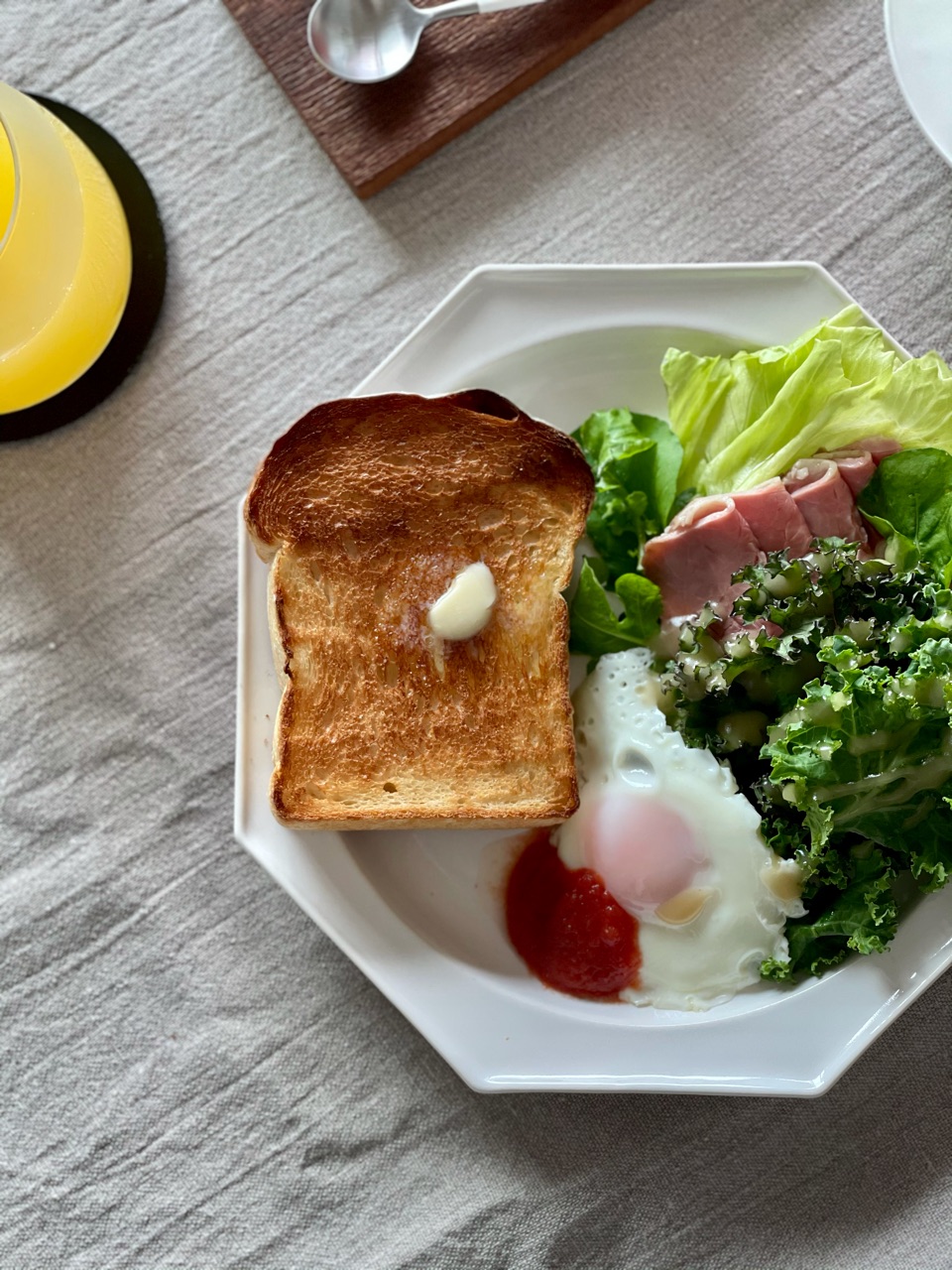 手作りパンや、サラダ、ローストビーフ、目玉焼きと共に。