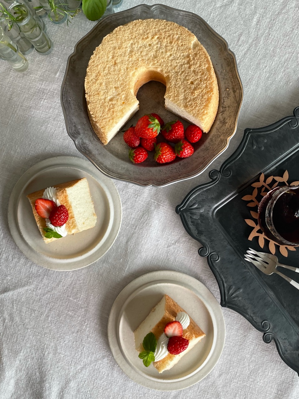 切れ目に、以前作ったルバーブといちごのジャムを挟んで、その上に生クリームを絞って、いちごとベランダのミントを飾りました。