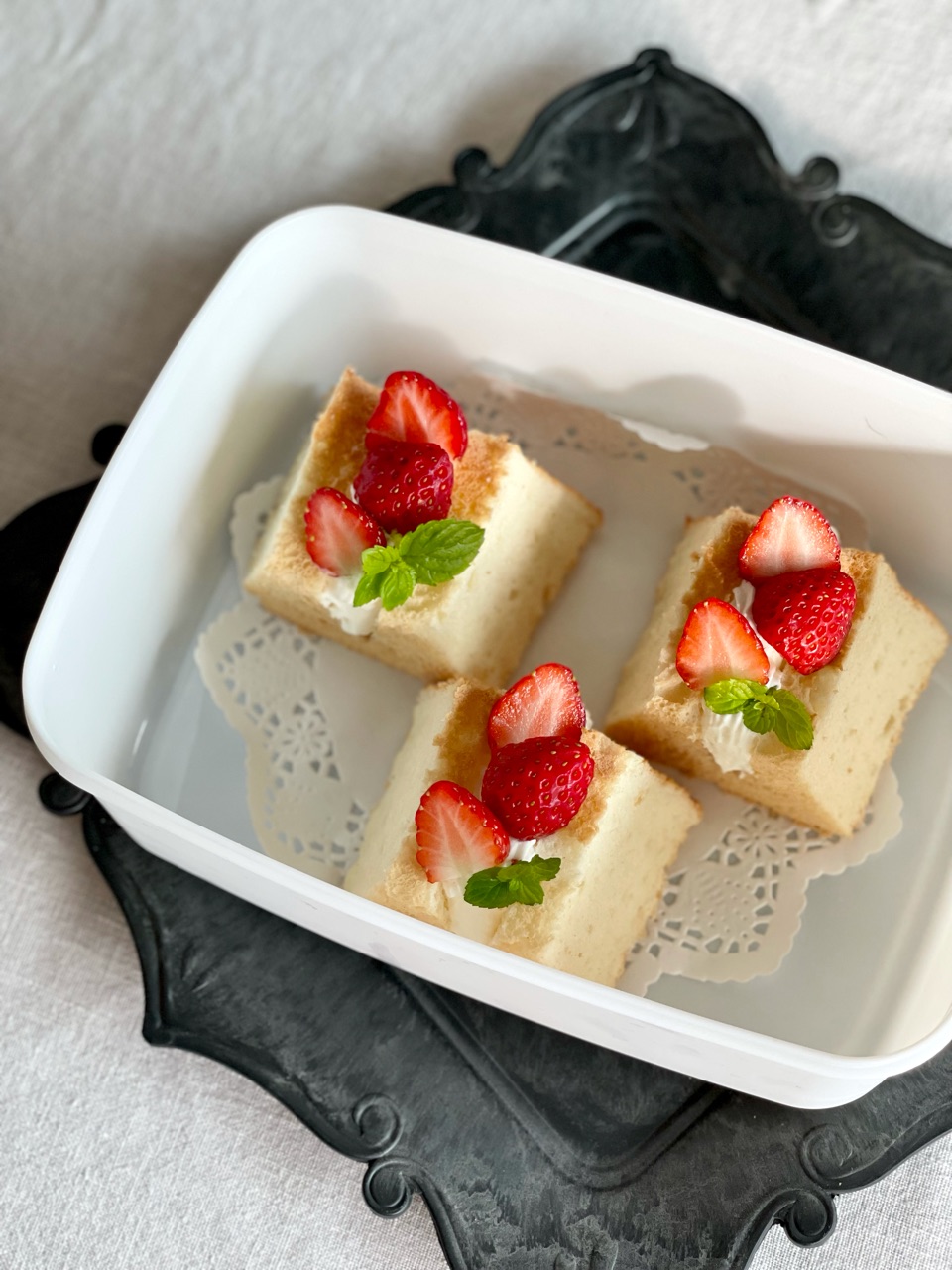 てことで、いちごや生クリームやジャムで、可愛いケーキに仕立てました。