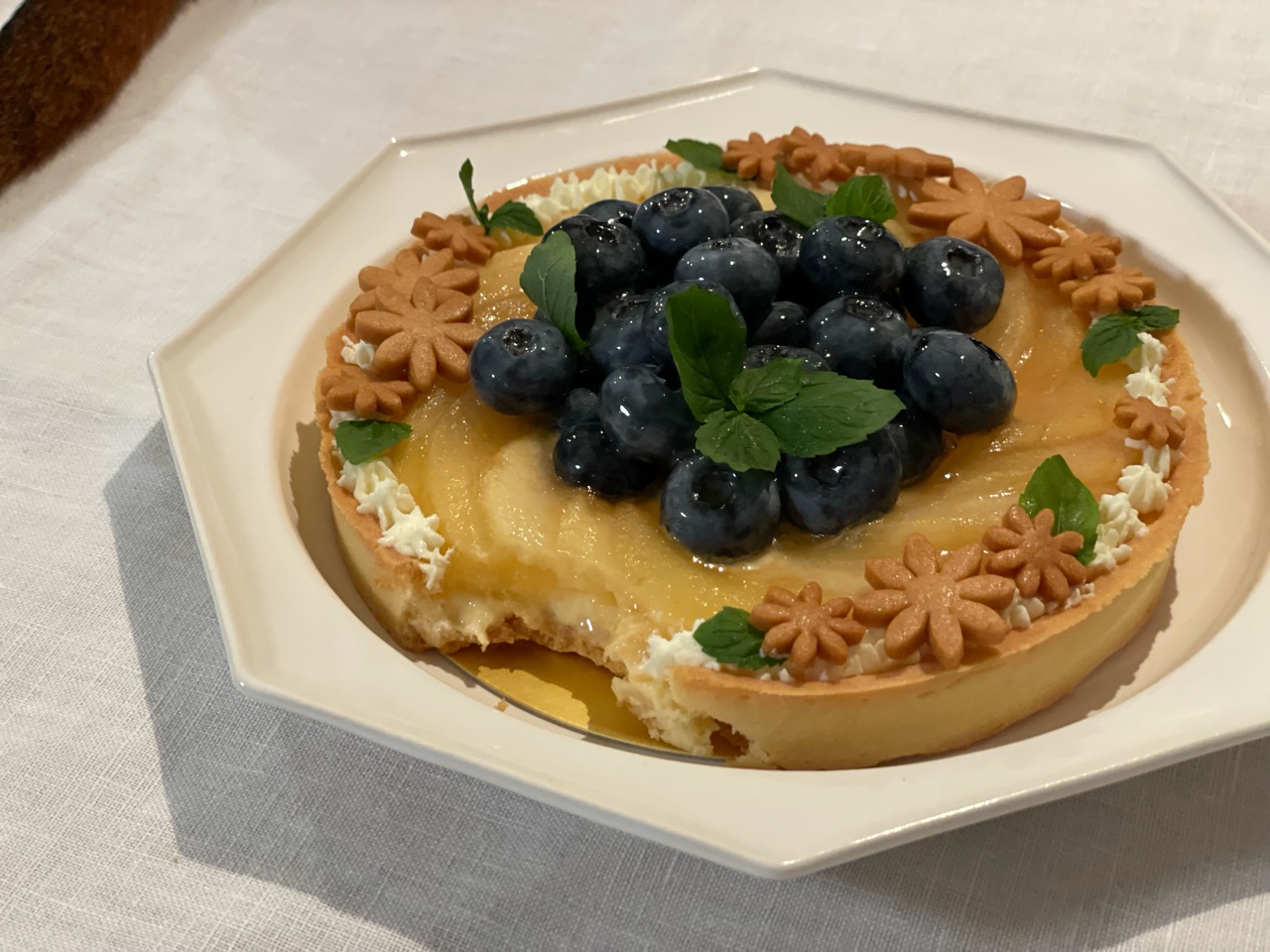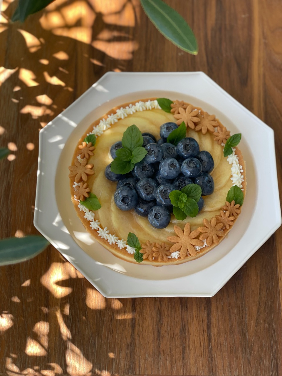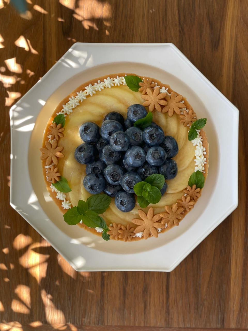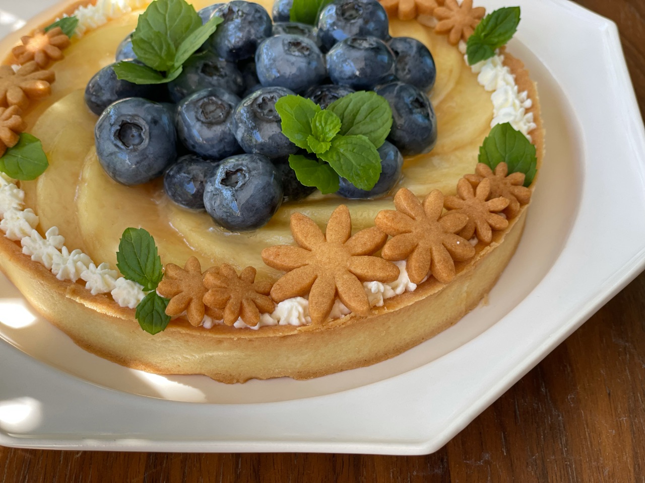 前回のタルトは、お花のクッキーをブルーベリーの上に散らしましたが、