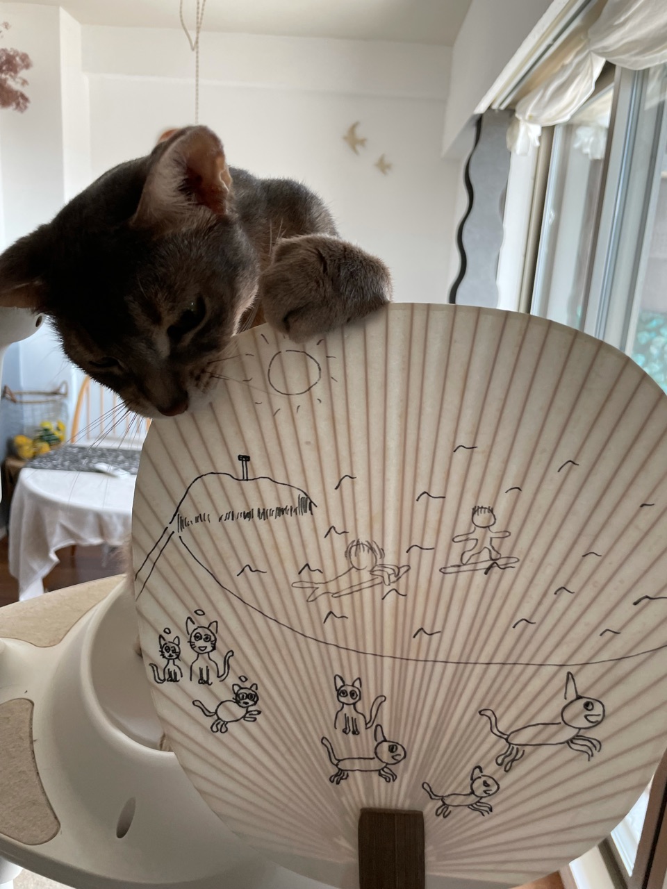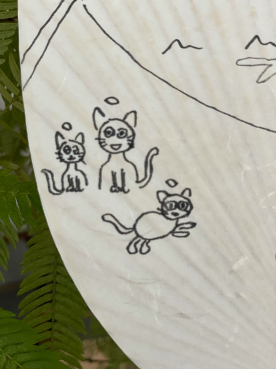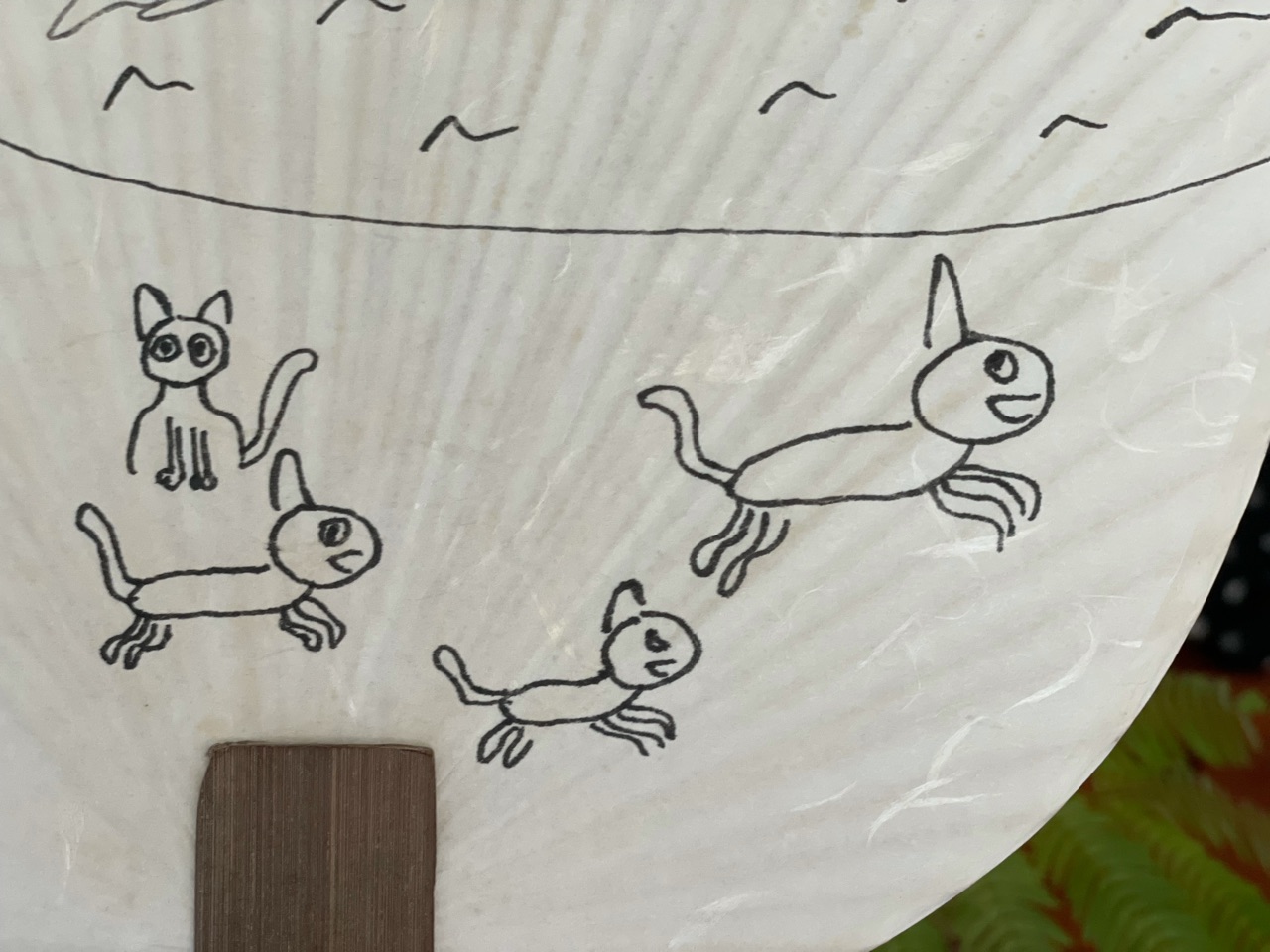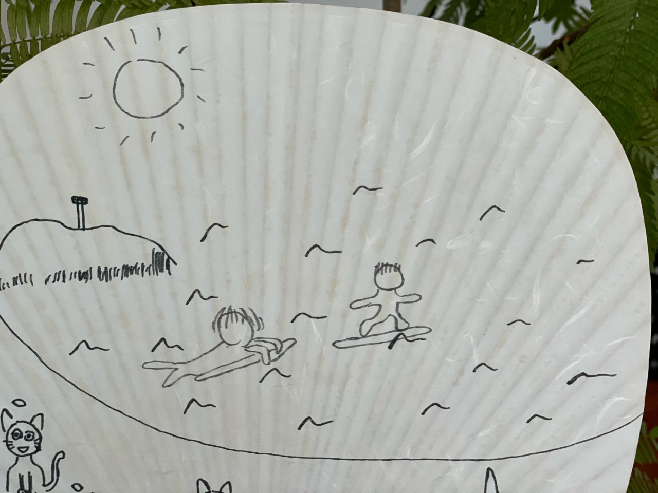 去年買ってあった、ダイソーの無地のうちわに、だんなさま画伯が絵を描きました。