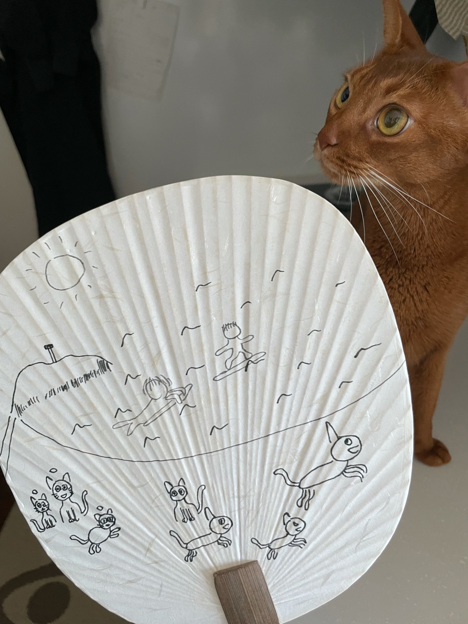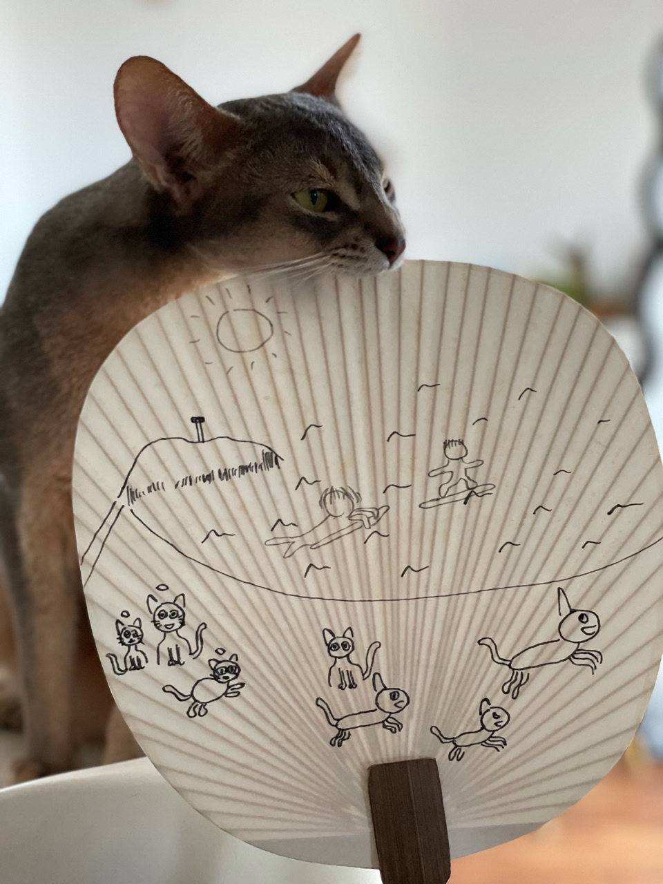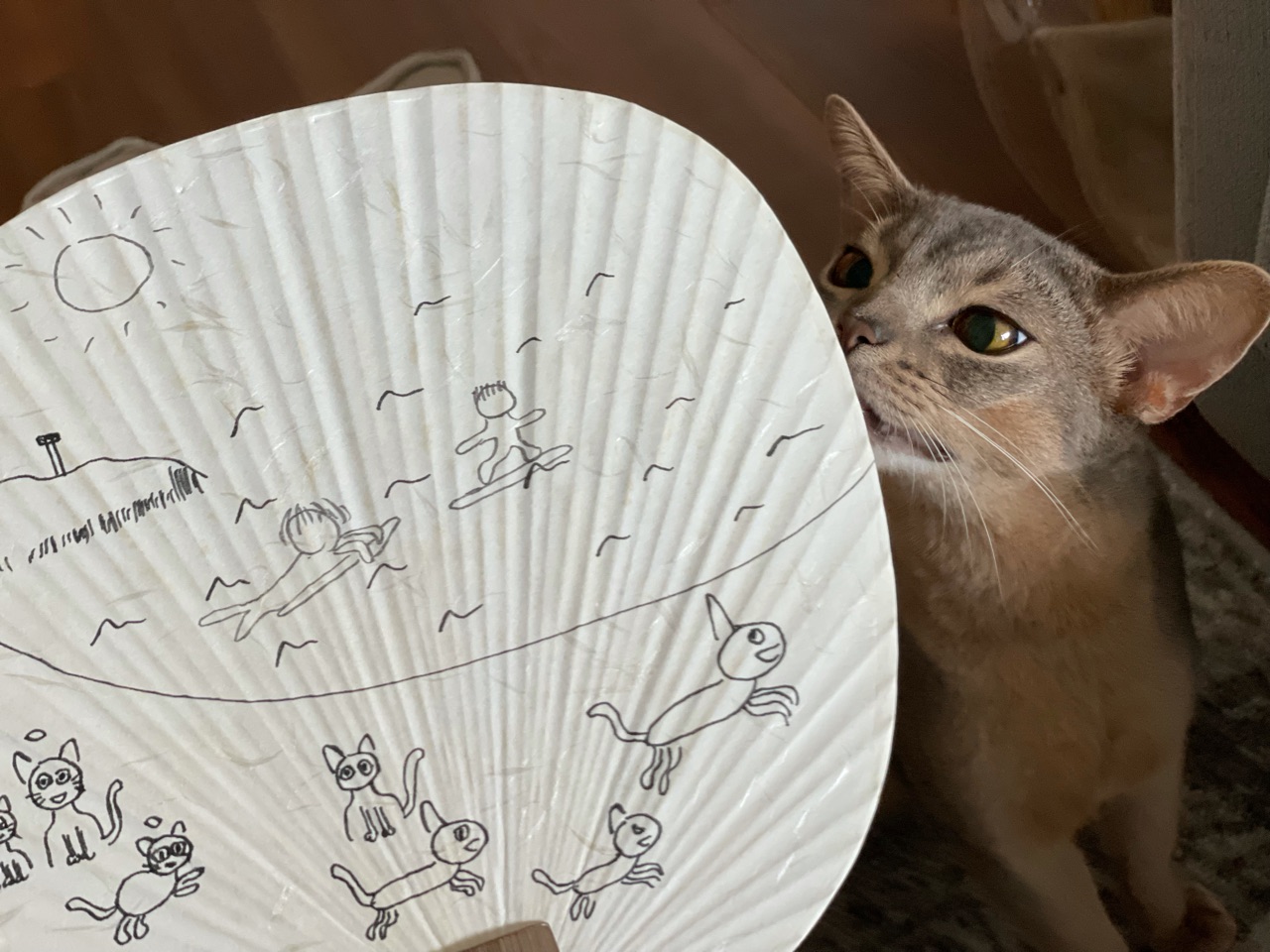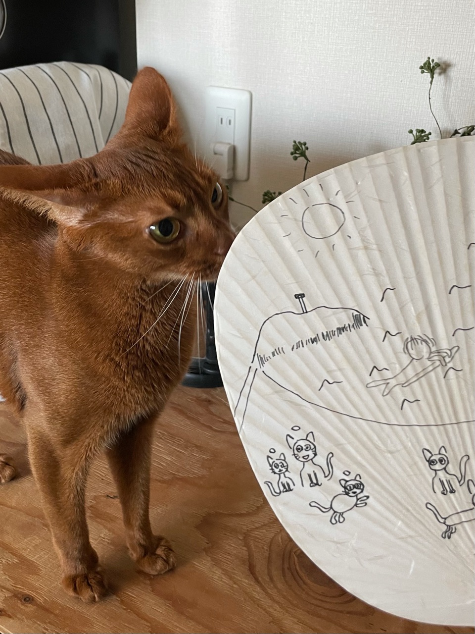 去年買ってあった、ダイソーの無地のうちわに、だんなさま画伯が絵を描きました。