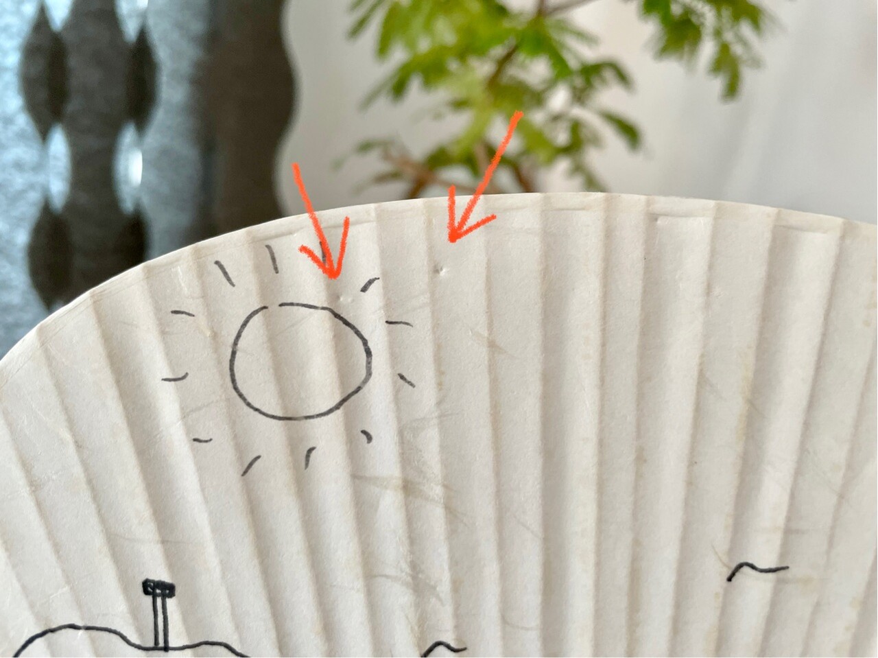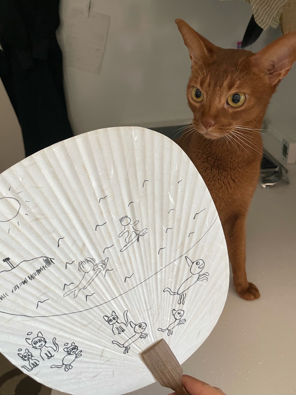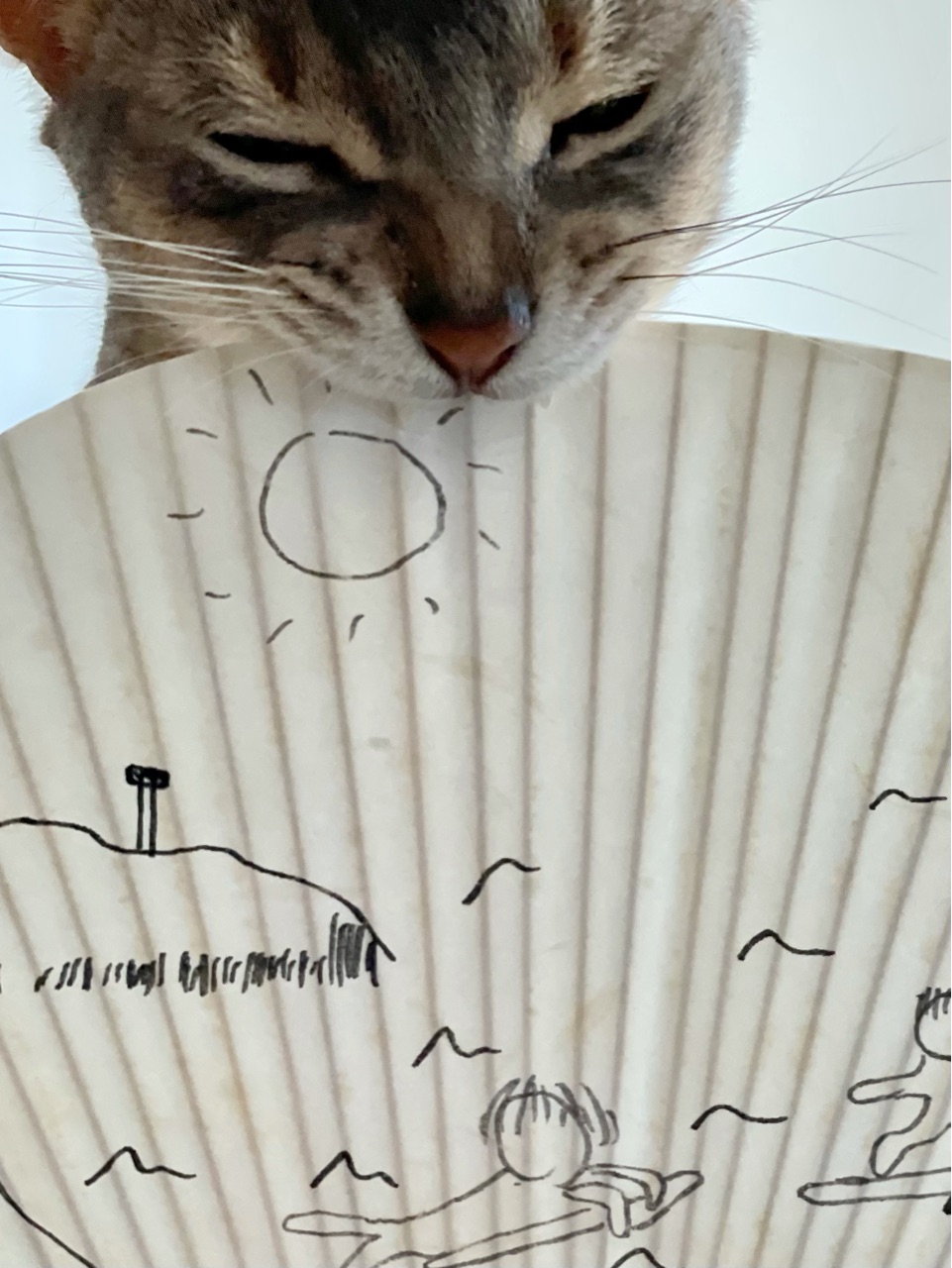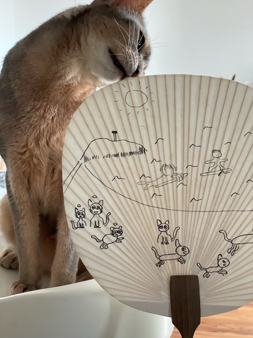 去年買ってあった、ダイソーの無地のうちわに、だんなさま画伯が絵を描きました。