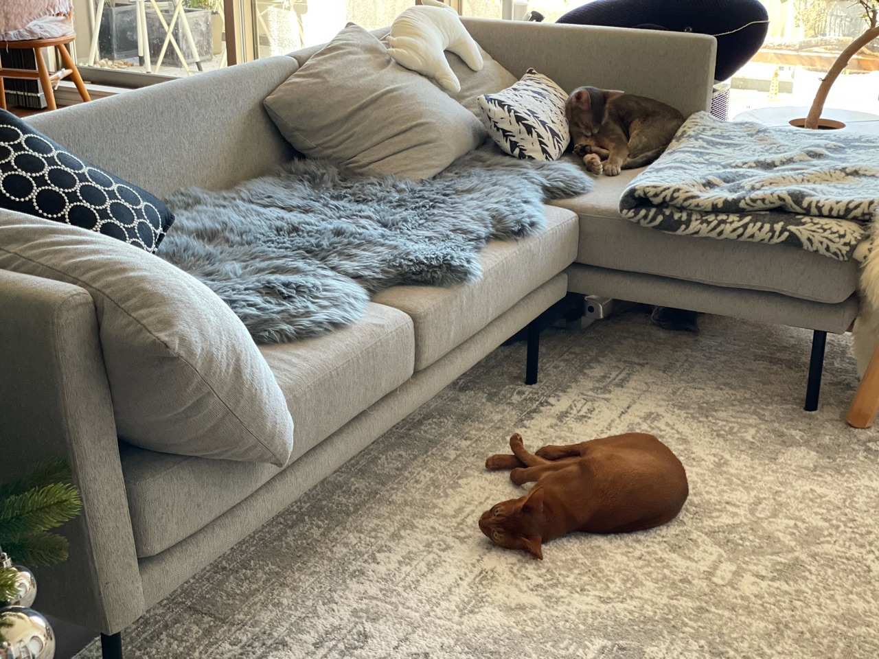 手前に転がっているのはひめちゃん、ソファーの下にちっこいグレーもいますよー。