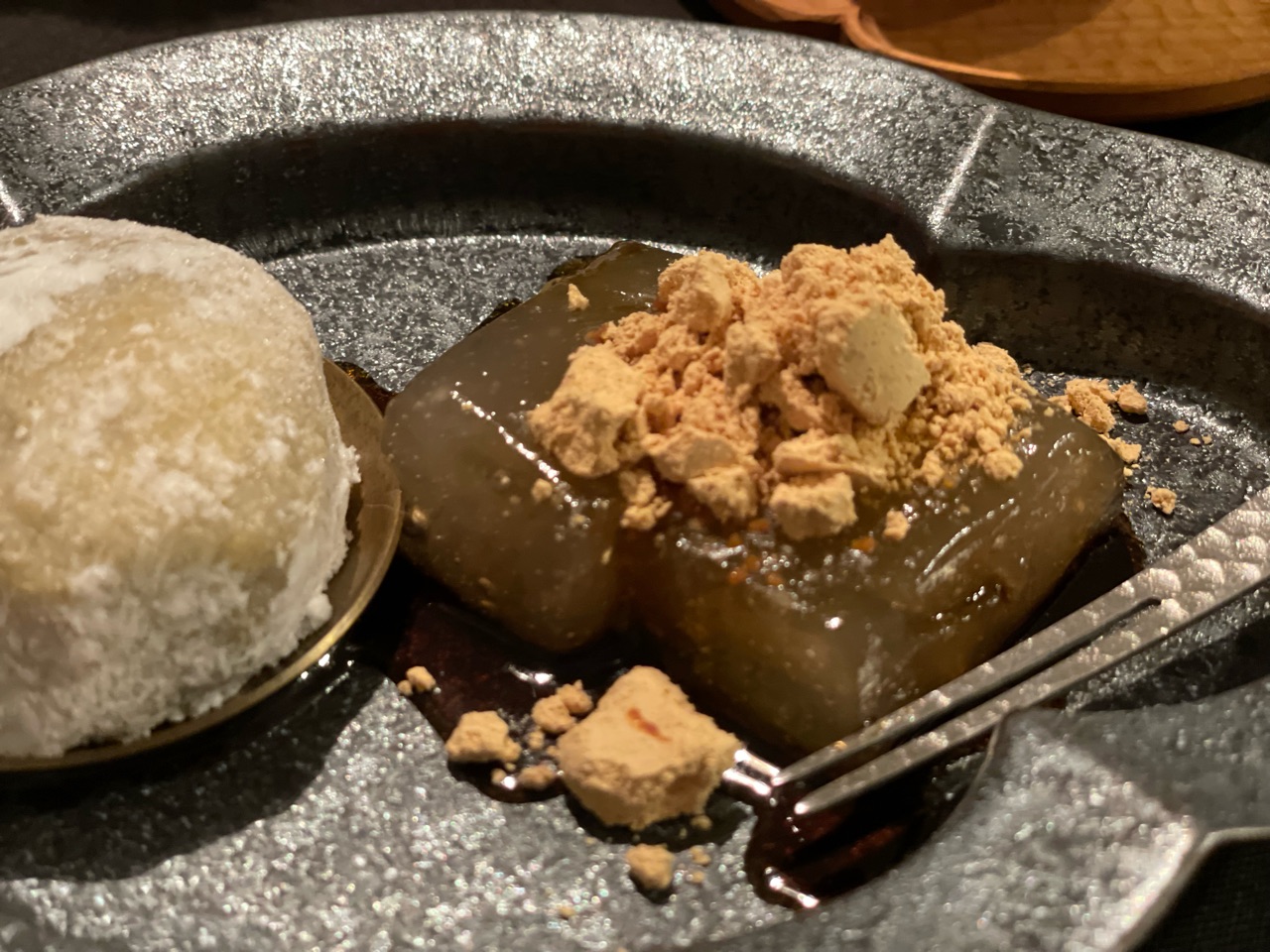 食後は、初詣帰りに買ってきた長嶋屋さんのあわ餅と、こ寿々さんのわらび餅。