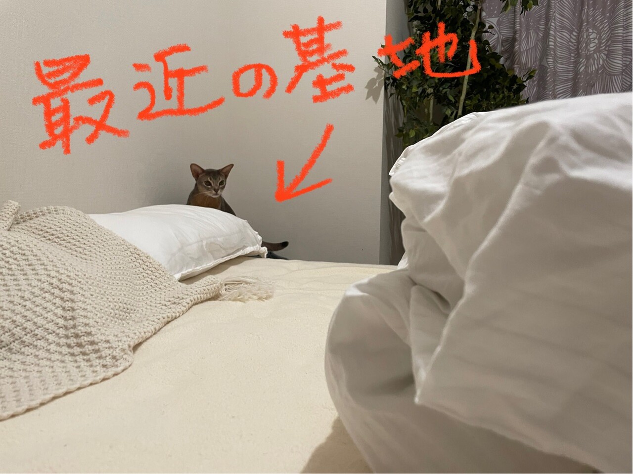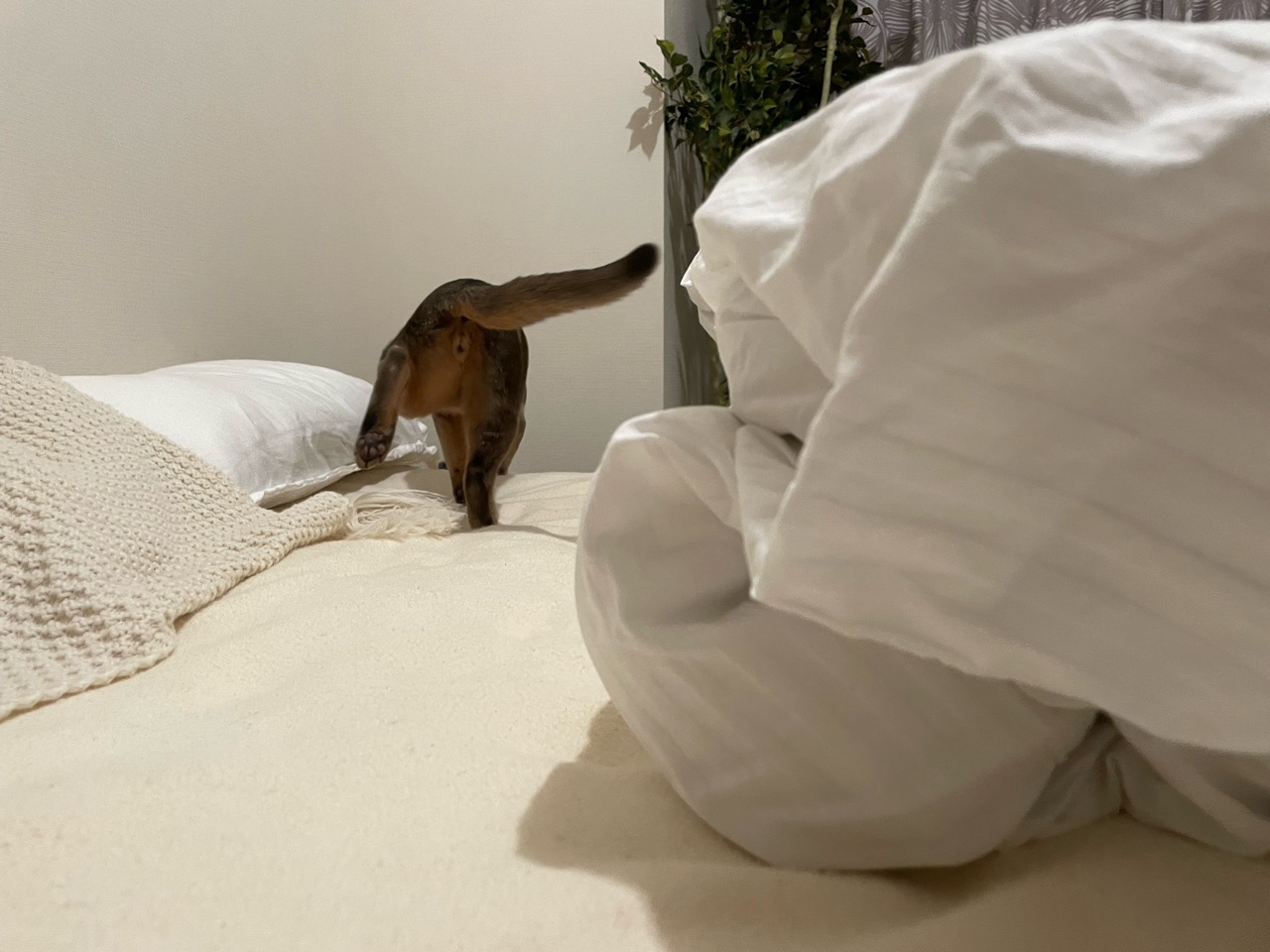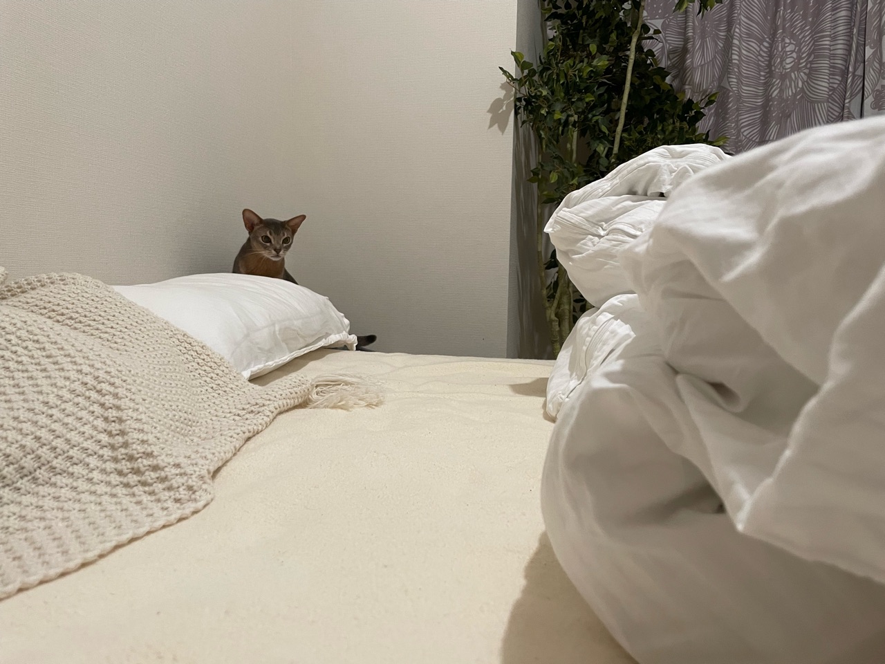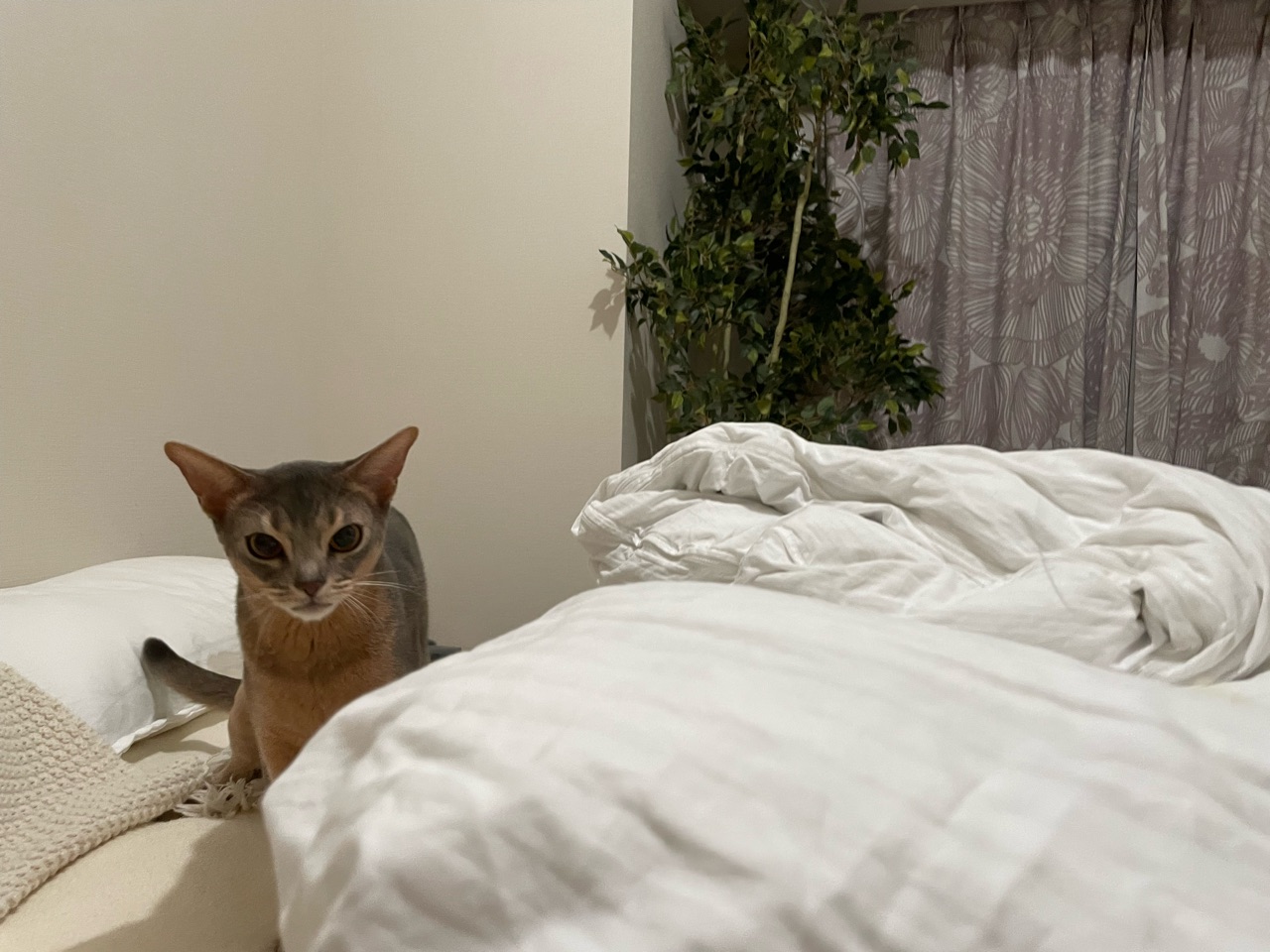 さて、そろそろ寝ようかなと寝室に行くと、期待に満ちた猫がいる。
