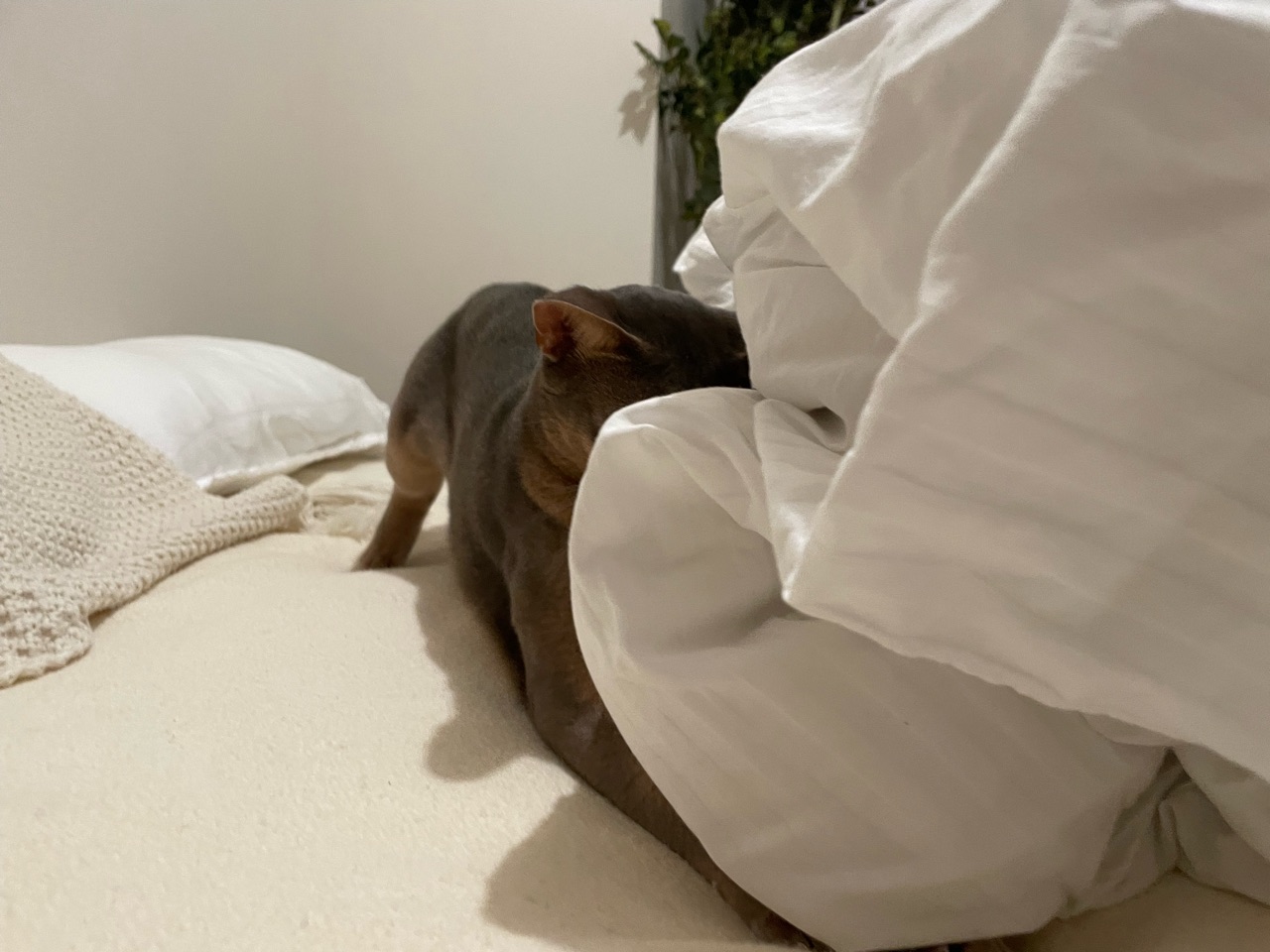 あそこから飛び出してきて、お布団山の下にズボーっと勢いよく潜り込むのにハマってるようです。