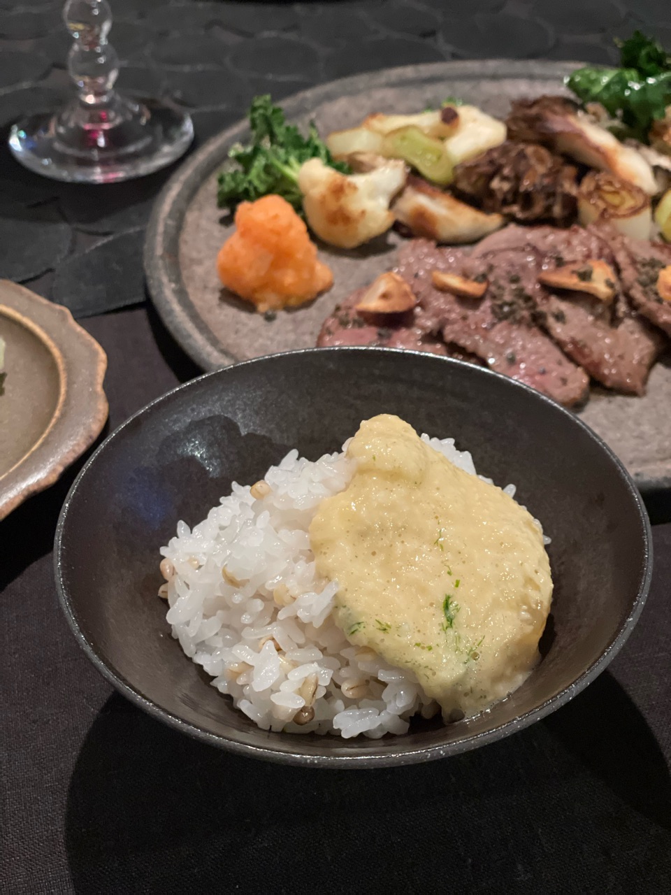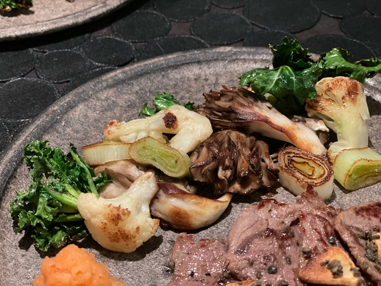 焼き野菜は、舞茸、カリフラワー、プチヴェール、白ネギ。