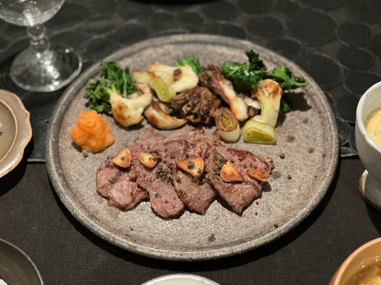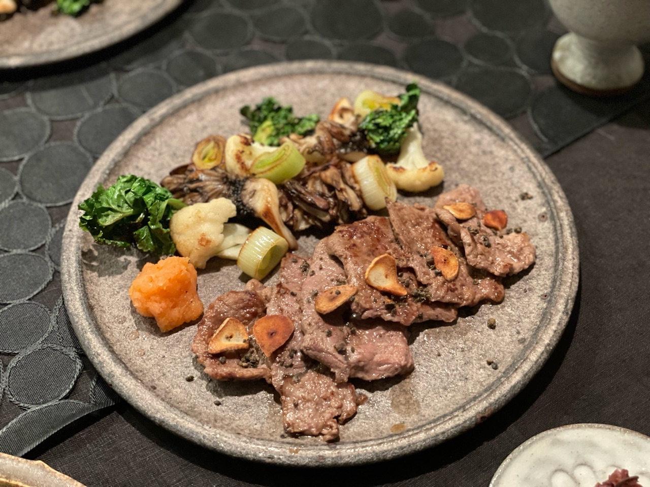 お肉が焼けたらお皿に盛って、ニンニクチップを散らして、塩胡椒でいただきました。