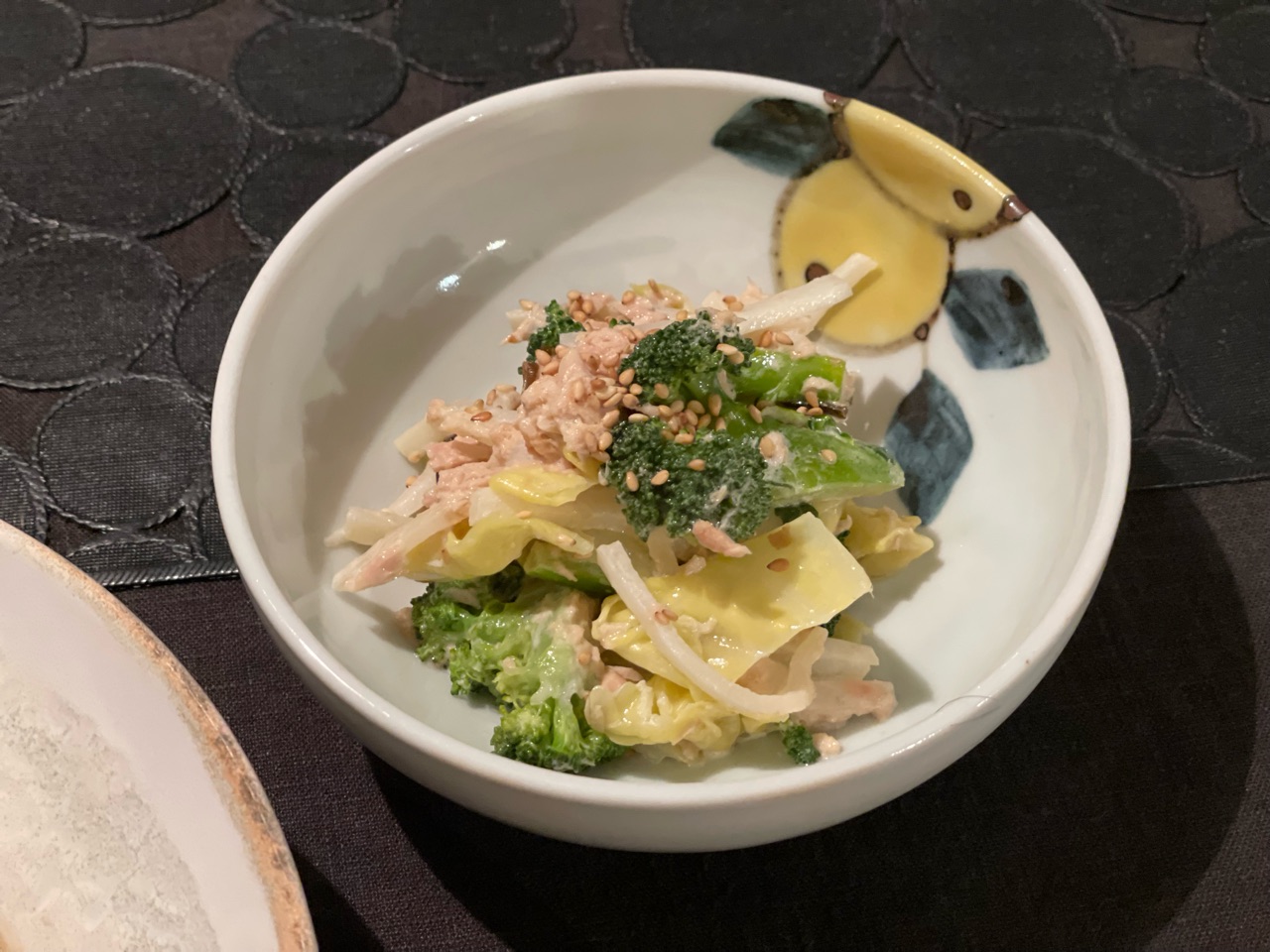 大根の皮を細切りしたものと、ブロッコリー、キャベツをレンチンして、ツナ、マヨネーズ、だし醤油、鰹節を和えました。