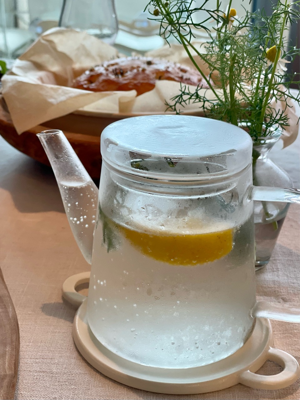 カットしたレモンとローズマリーひと枝を入れたポットに炭酸水を入れただけなんですけど、爽やかで美味しいです✨