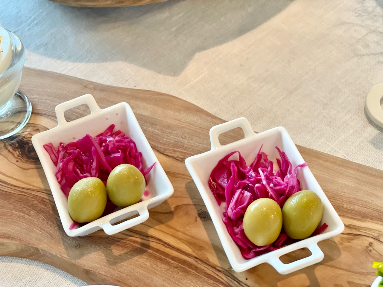 作り置きの紫キャベツのピクルスと、ご近所さんの差し入れのオリーブ