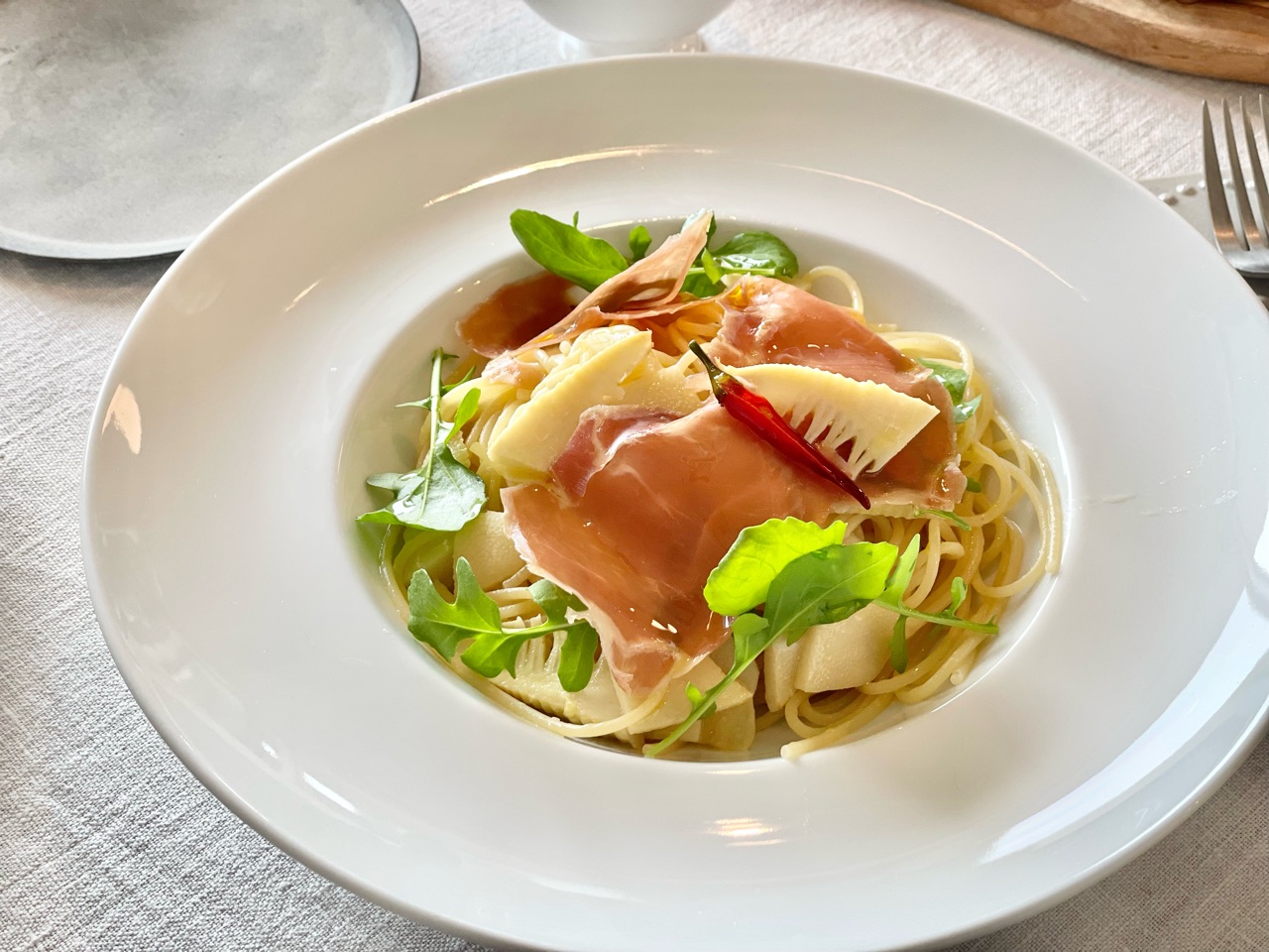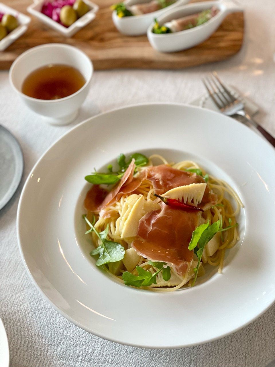 お料理を食べたところで、たけのこのパスタ✨具材やお湯はあらかじめ用意しておいて、途中で調理して、出来立てを食べてもらいました。