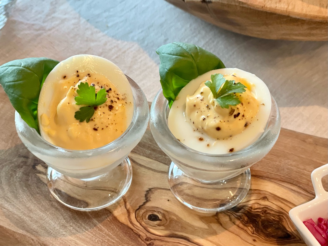 ゆで卵の黄身を取り出して、マヨネーズとトリュフオイルと新玉ねぎのみじん切りを混ぜて、白身の中に戻してあります。